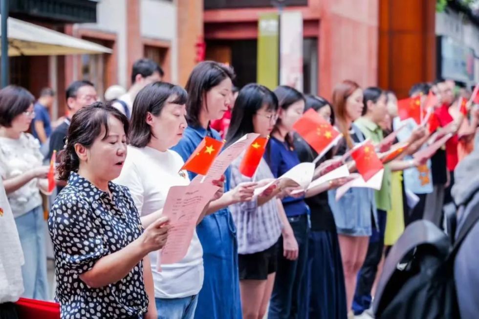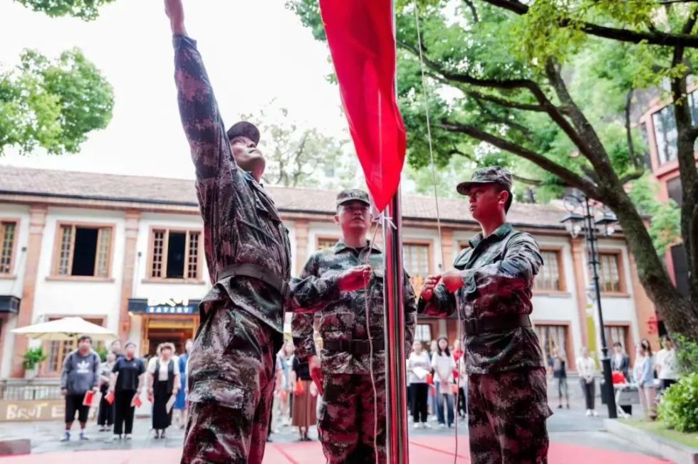 伴随着嘹亮的《义勇军进行曲》,五星红旗在众人的注目礼中缓缓升起,现场所有人肃立,齐声高唱国歌,表达了对祖国深深的热爱与祝福。
