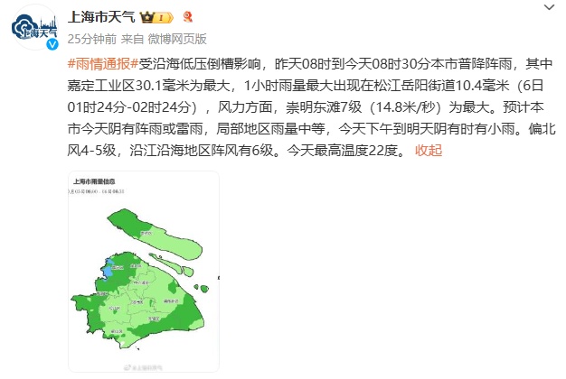 预计上海今天阴有阵雨或雷雨