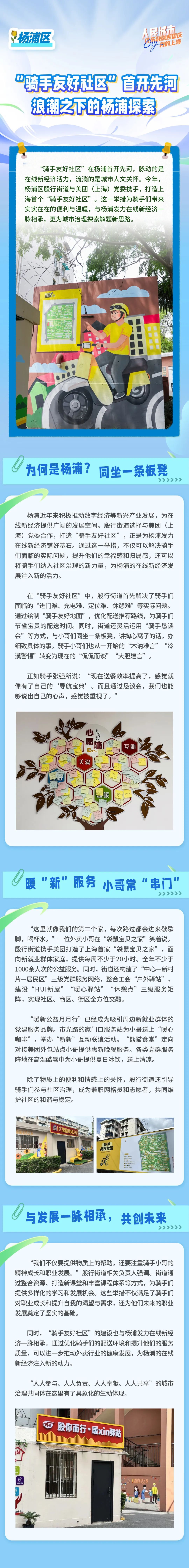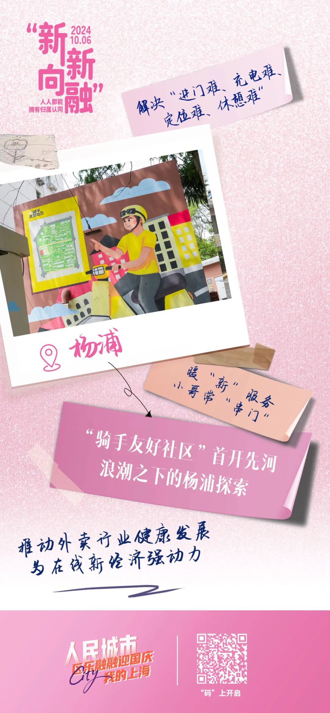 他们步履匆匆、使命必达 穿梭于大街小巷,连接起千家万户 传递着人间烟火 他们是社会运转的螺丝钉 美好生活的守护人 他们与这座城 双向奔赴 “新新”向“融” “区乐融融迎国庆 City我的上海” 上海区级融媒体 国庆大联欢活动持续上新 “新新”向“融”互动小游戏 以新业态新就业群体为第一视角 开启指尖上的citywalk 解锁有温度的城市地图 一起来看杨浦区 如何打造“骑手友好社区” 当骑手们的“娘家人” 爱心驿站里的一瓶饮料、一缕清凉 带来酷暑中的小确幸 城市建设者之家的一张床、一间房 托举起稳稳的幸福 街头的能量补给站赠送片刻小憩 让他们充电蓄力 元气满格再出发…… 这些隐藏在 林立高楼中的温情角落 用暖“新”服务 凝聚城市向“新”力 让人人归属认同 让申城新新向“融” 扫描海报“二维码” 或点击下方“阅读原文” 即可参与趣味互动 下载“上海杨浦APP” 进入活动专题 完成连续打卡7天任务 还可参与抽奖活动哦! 抖音、新浪微博等平台 同步开启话题互动 期待您的参与 明日预告 假期第7天 “区乐融融迎国庆 City我的上海” 上海区级融媒体国庆大联欢活动之 “人人爱上海” 即将来袭 准备好花式表白大上海吧! AI上海,Let’s meet!