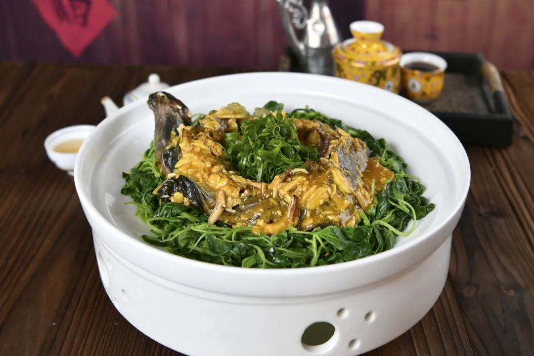这道诞生于上世纪80年代的阳澄战赤壁,是王宝和的古法蟹菜,俗称甲鱼烧蟹粉。烹饪时需先煸蟹粉,甲鱼去壳,随后将煸好的蟹粉灌入甲鱼腹部,翻身、同煮,使得蟹粉和甲鱼的鲜味完美融合。