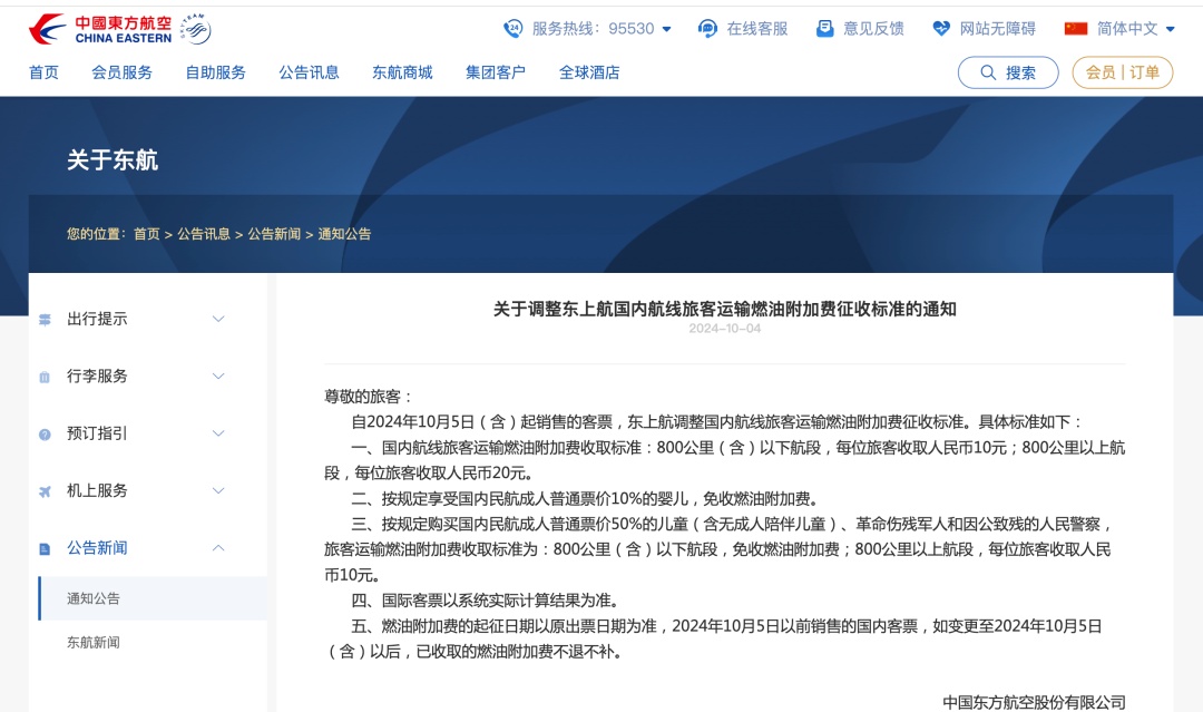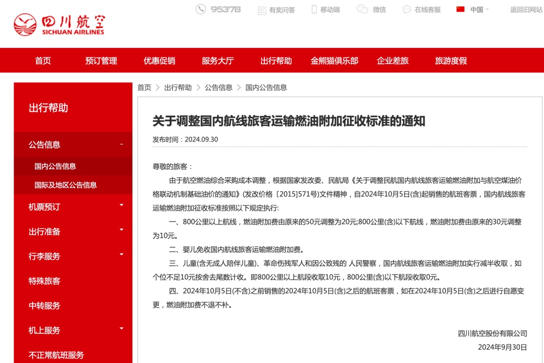 需注意的是,燃油附加费价格按出票时间计算,10月5日之后出票才能享有新价格,10月5日之前出的票,即便是10月15日才出行,燃油附加费也按原来的30元和50元。