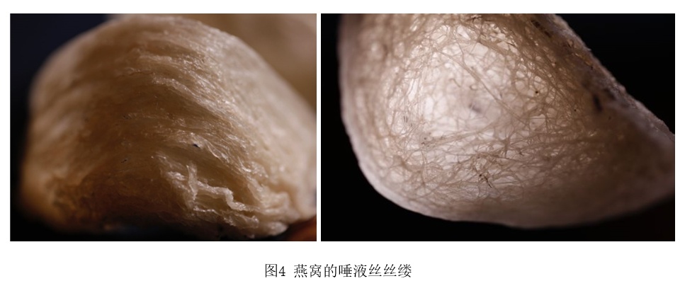 燕盏形状虽然类似,组成燕盏的丝缕结构却不相同。根据造窝需要,金丝燕吐出的唾液丝中间常有琢断再续的痕迹,丝缕长短并不均一,排布也不会特别整齐。自然的造窝过程,使得每个燕盏的丝缕呈现“大同而小异”。如果买到的燕窝丝缕整整齐齐,刻板均一,反而要警惕是否存在用粉丝等其他材料伪造的可能。