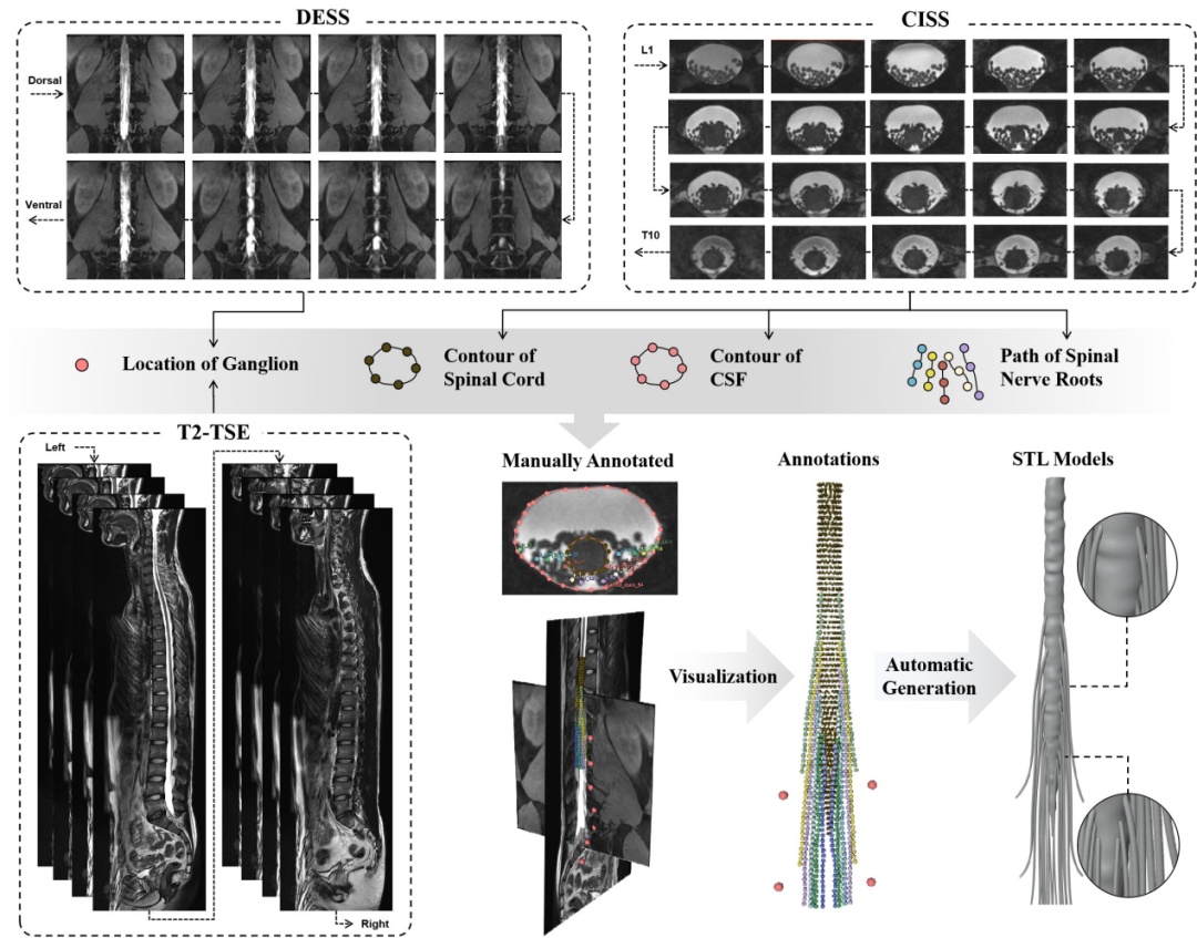 如何精准刺激脊髓神经根,对下肢相应肌群进行交替激活,从而重建行走步态?加福民团队使用张江影像中心的3T磁共振成像设备,创新设计了包含多种扫描序列的成像方案,并基于人工标签构建自动化重建算法模型,从而精确捕捉腰骶段脊髓神经根结构特征。相关数据和生成的个体化脊髓神经根模型近期已开源,为神经康复领域专家开展脊髓神经调控基础研究提供支撑。