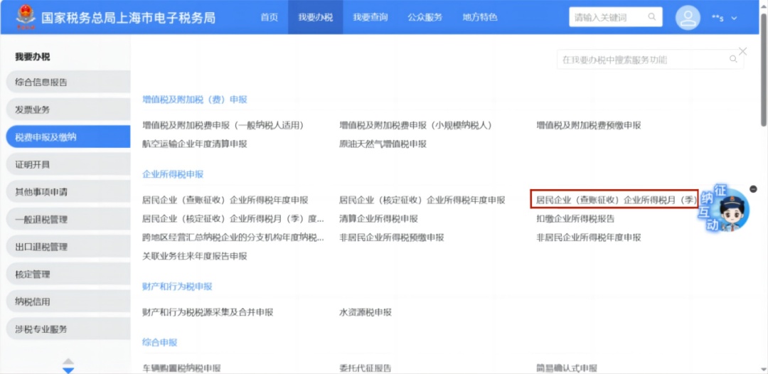 1. 登录新电子税局,点击【我要办税】——【税费申报及缴纳】——【企业所得税申报】,选择“居民企业(查账征收)企业所得税月(季)度申报”进入申报界面。