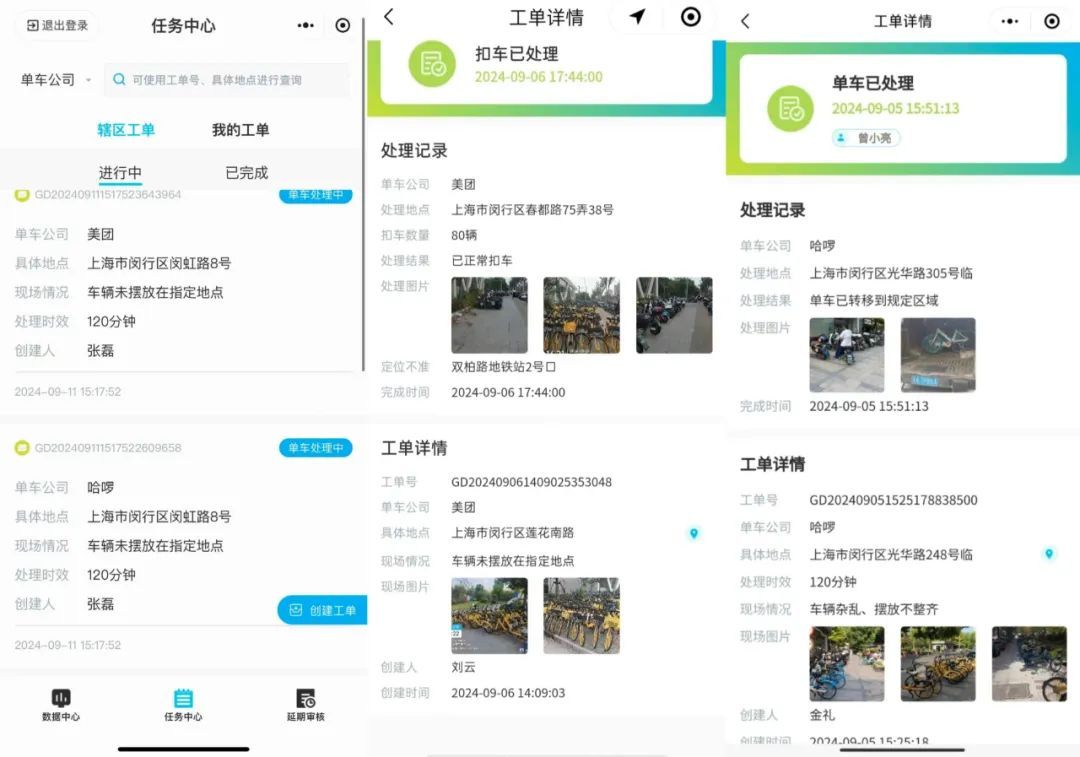 “您好,工单已指派给您,地点为莘庄镇地铁站南口,请在2小时内处理完成。”每天的早高峰时段,随着共享单车的锁车声在城市道路旁响起,单车运维员小李都会收到这样的微信小程序工单,提醒他及时清理“淤积”的单车。