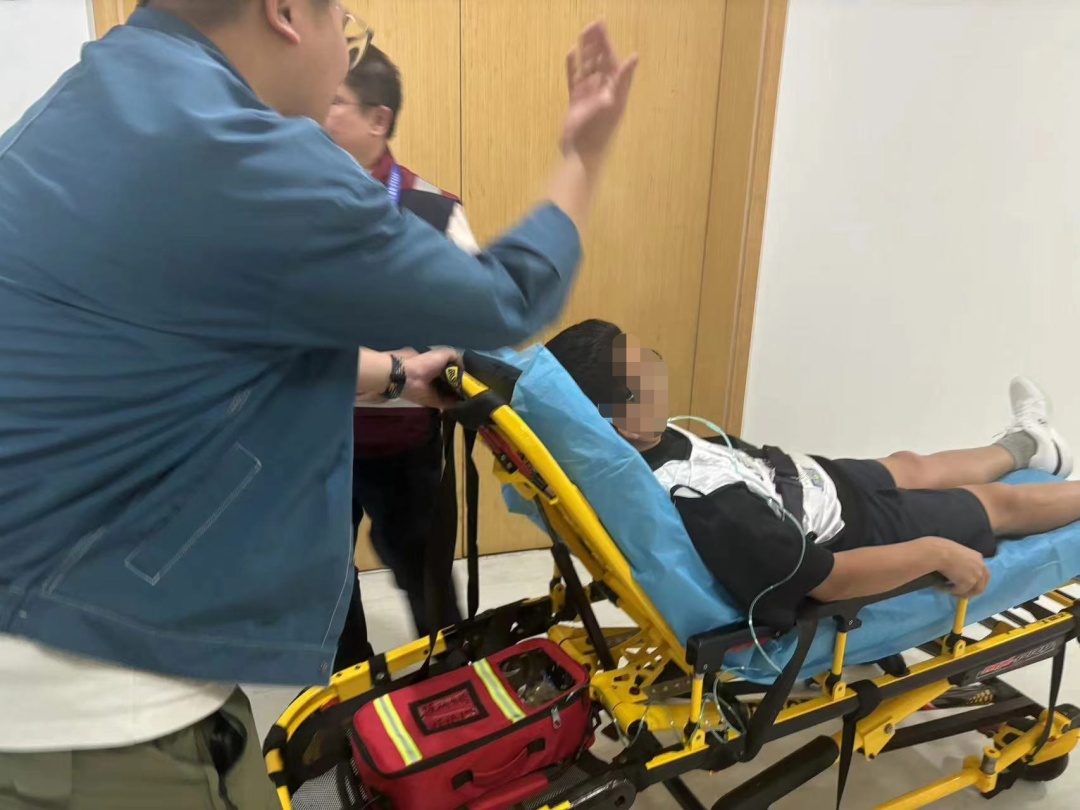 原来他是赛场的一名摄影人员,工作时突发不适。驻点保障医疗组随即启动救治程序。急救医生黄培兰为患者开展紧急救助,急救员陆超协助医生为患者吸氧,其他医疗工作人员同步为患者进行生命体征测量,发现患者血压异常升高。