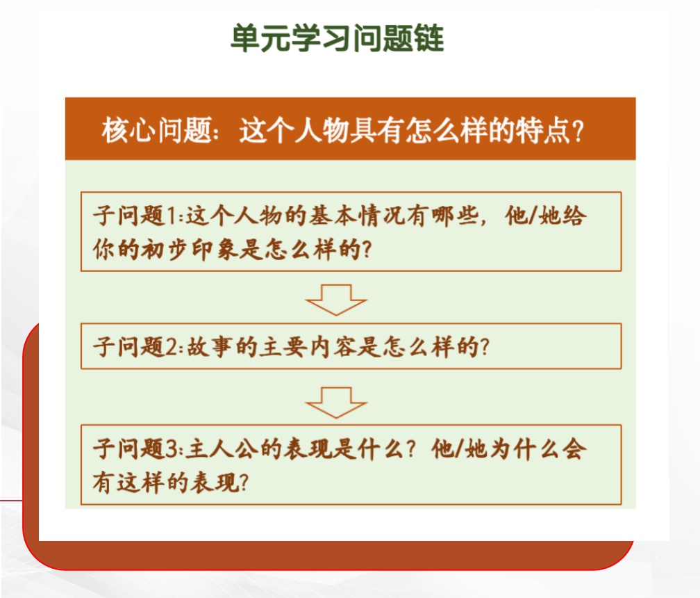 他举了一个例子,小学语文课本第八册的第八单元的课文为童话故事,这一单元的语文要素是让学生们感受童话的奇妙,体会人物真善美的形象。因此,教师们在解析了单元语文要素后,设计了单元学习问题链,帮助学生更好地理解故事中人物的心理和性格特征,感受童话故事的生动有趣。