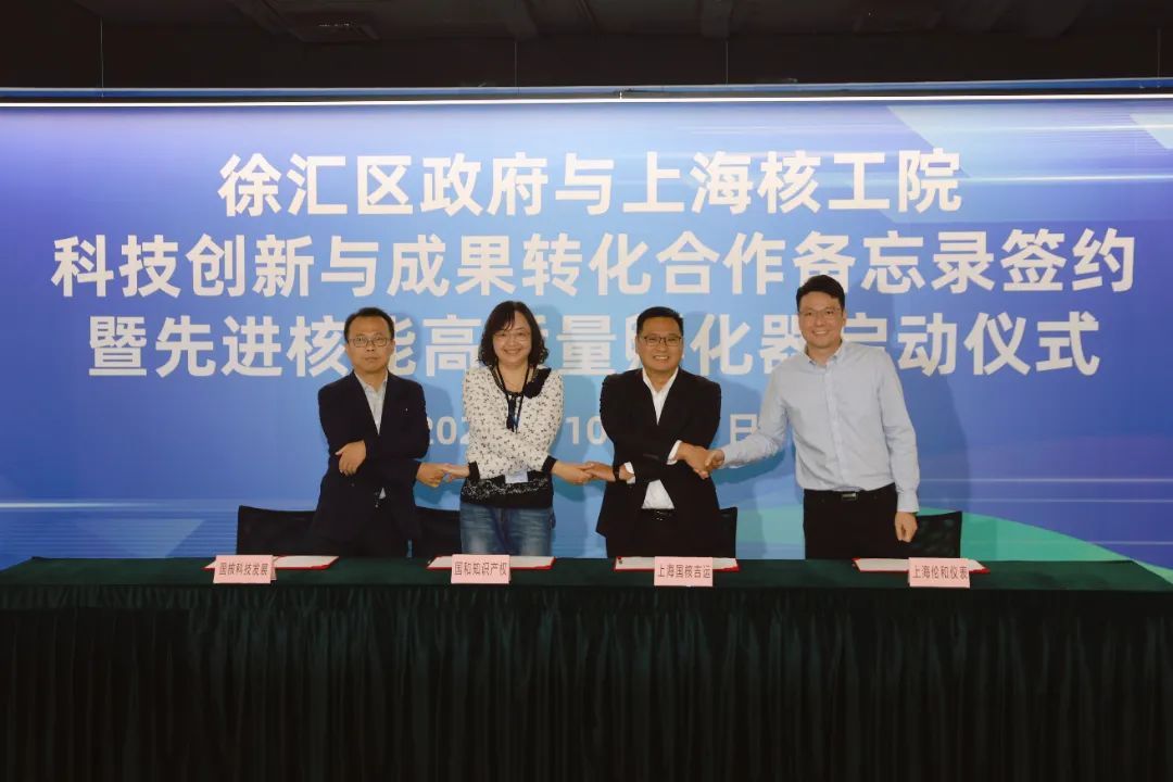 10月10日下午,徐汇区人民政府与上海核工程研究设计院股份有限公司签署合作备忘录暨先进核能高质量孵化器启动仪式在华鑫慧享城举行。徐汇区委书记曹立强,区委常委、副区长俞林伟,副区长魏兰,华东理工大学党委常委、副校长赵黎明,上海电力大学副校长符扬,国家电投副总经理、上海核工院董事长卢洪早,上海核工院党委书记叶元伟,副总经理兼总会计师周俊颖出席活动。
