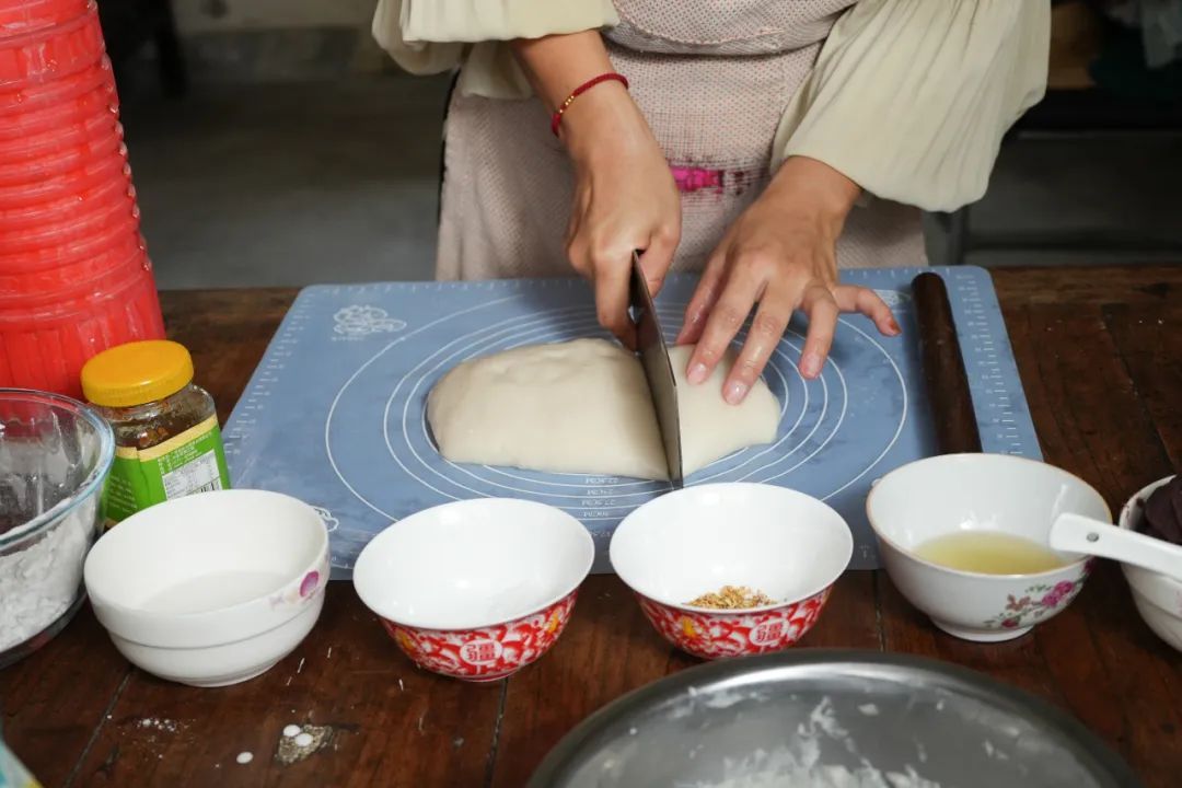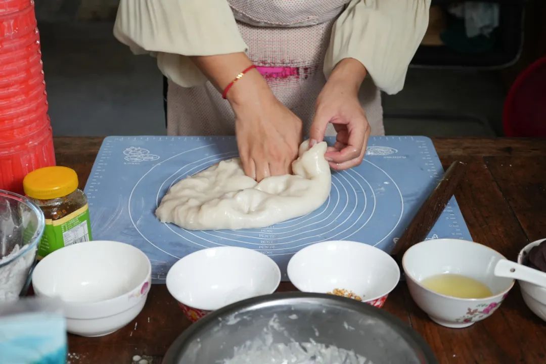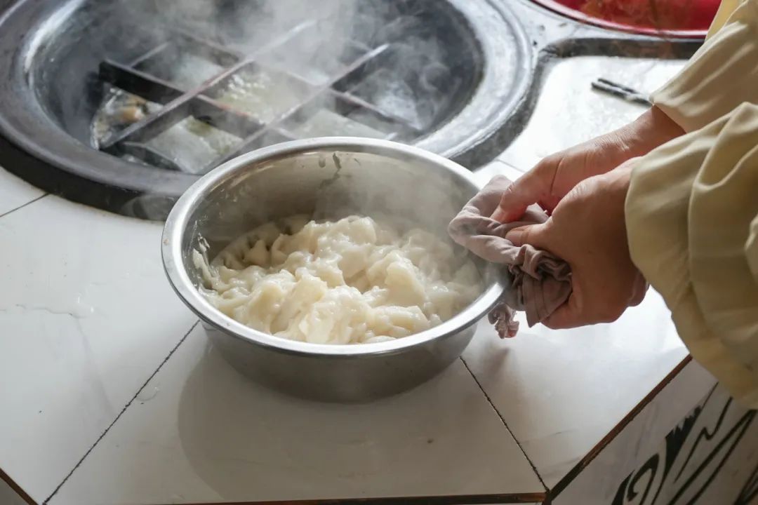 待水烧开后,将糯米团放入灶头蒸煮,其间需要开盖搅拌,将中心没有蒸熟的部分翻上来后继续蒸煮,确保整个糯米团都熟透,否则会特别粘手。