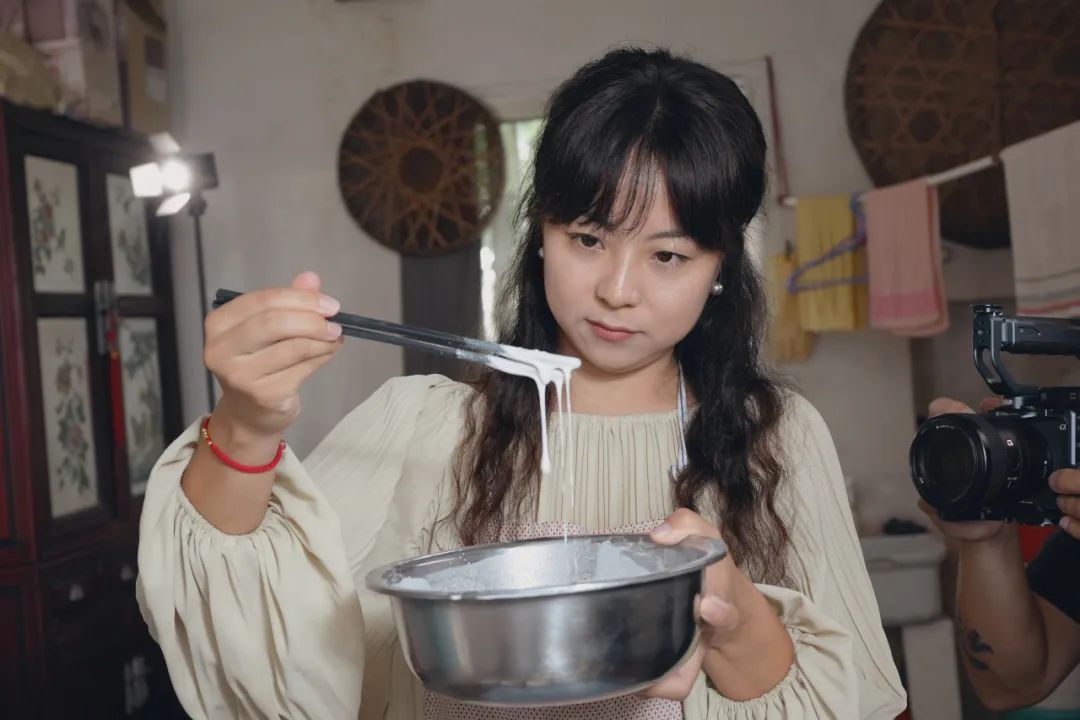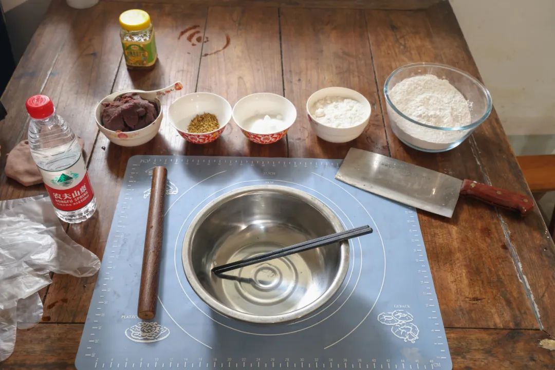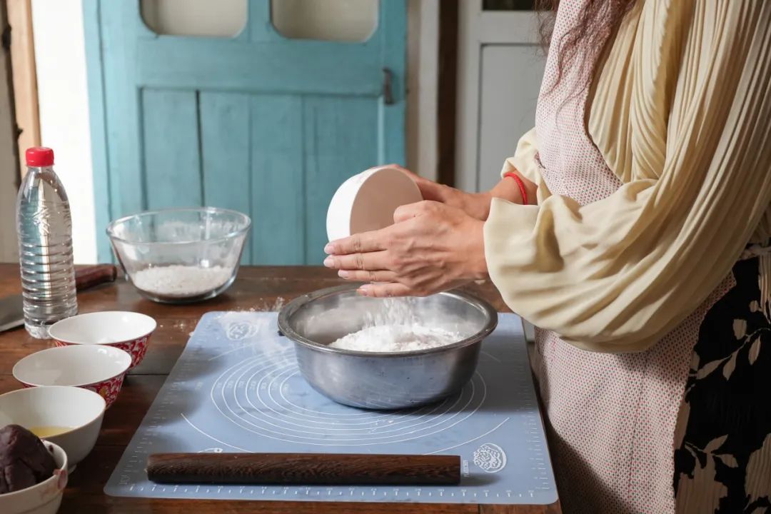 首先将糯米粉、粘米粉和糖混合,如此糯中才能带一些韧劲和甜味。然后分次加入适量水并充分搅拌,可以通过液体流速判断水的用量。