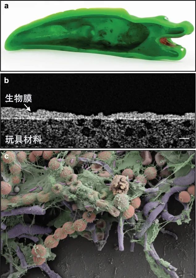 a 在真实条件下使用的沐浴玩具的内表面;b 同一沐浴玩具表面生物膜结构和厚度的光学相干断层扫描图像(比例尺:50μm);c 扫描电子显微镜图像