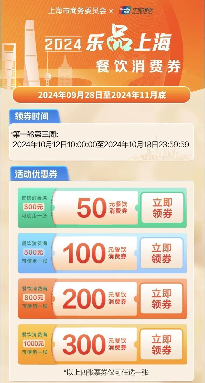 市商务委介绍,10月12日周六上午10点,“乐品上海”餐饮消费券将再次发放。银联云闪付、支付宝、微信支付三家支付平台的领券攻略公布如下。本批“乐品上海”餐饮消费券和前两批有所不同,有效期由之前的自发放之日起7天延长至10天。消费者在领取消费券后须在2024年10月21日23:59之前使用,若成功领券但没有使用,过期失效。 市文化旅游局介绍,根据安排,第三周“乐游上海”住宿消费券将于10月12日上午11:00在云闪付、支付宝、微信平台发放,之后每周六上午11:00都将发放!为进一步提升消费券使用体验,自本周次开始,云闪付、支付宝、微信三大平台全部支持全国范围内在线领券、在线核销,消费者在线预订上海酒店时使用消费券将更加便捷。 此外,2024“乐影上海”电影消费券,每天10:00/16:00持续发放,大家可以去猫眼、淘票票等平台领取。“乐动上海”体育消费券仍在每天8点、12点、18点三个时段发放。详见↓