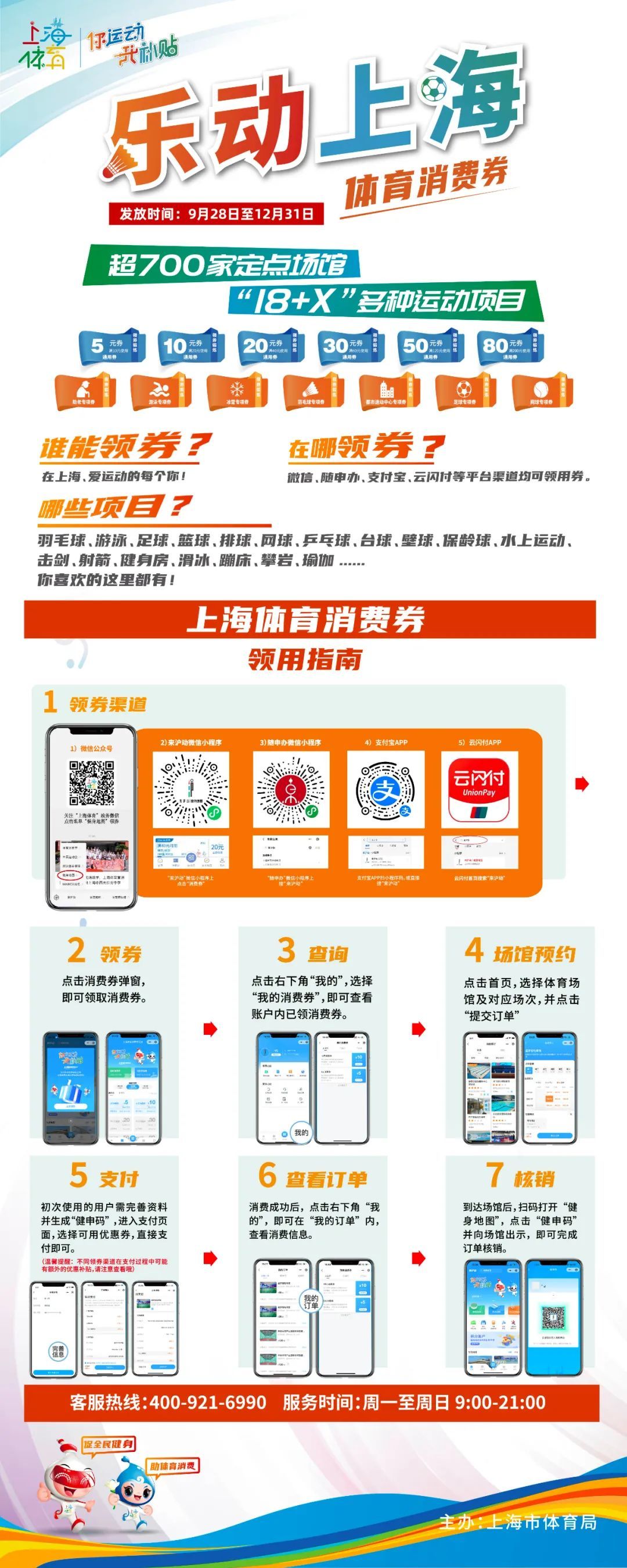 此外,还将设置游泳、羽毛球、冰雪运动、助老、都市运动中心、足球、网球等针对特定项目、特定人群的专项体育消费券,覆盖青少年、中青年、老年人等各类人群,满足市民多层次、个性化的健身需求。专项体育消费券面值将通过市体育局建立的体育消费券配送信息平台(“来沪动丨健身地图”)具体公布。