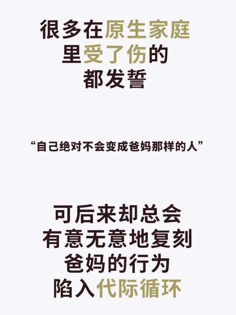 其实,真正的“孝”应当是不断修正家族内部的缺陷与弊端,打破“代际传递”的循环,传承和发扬进步的、高尚的观念或品质。越来越多的人已经开始意识到这一点,并通过心理咨询和自主学习来寻求家庭模式如何影响自己的底层逻辑,通过不断改变自我认知和行为模式,调整对下一代的教育模式。