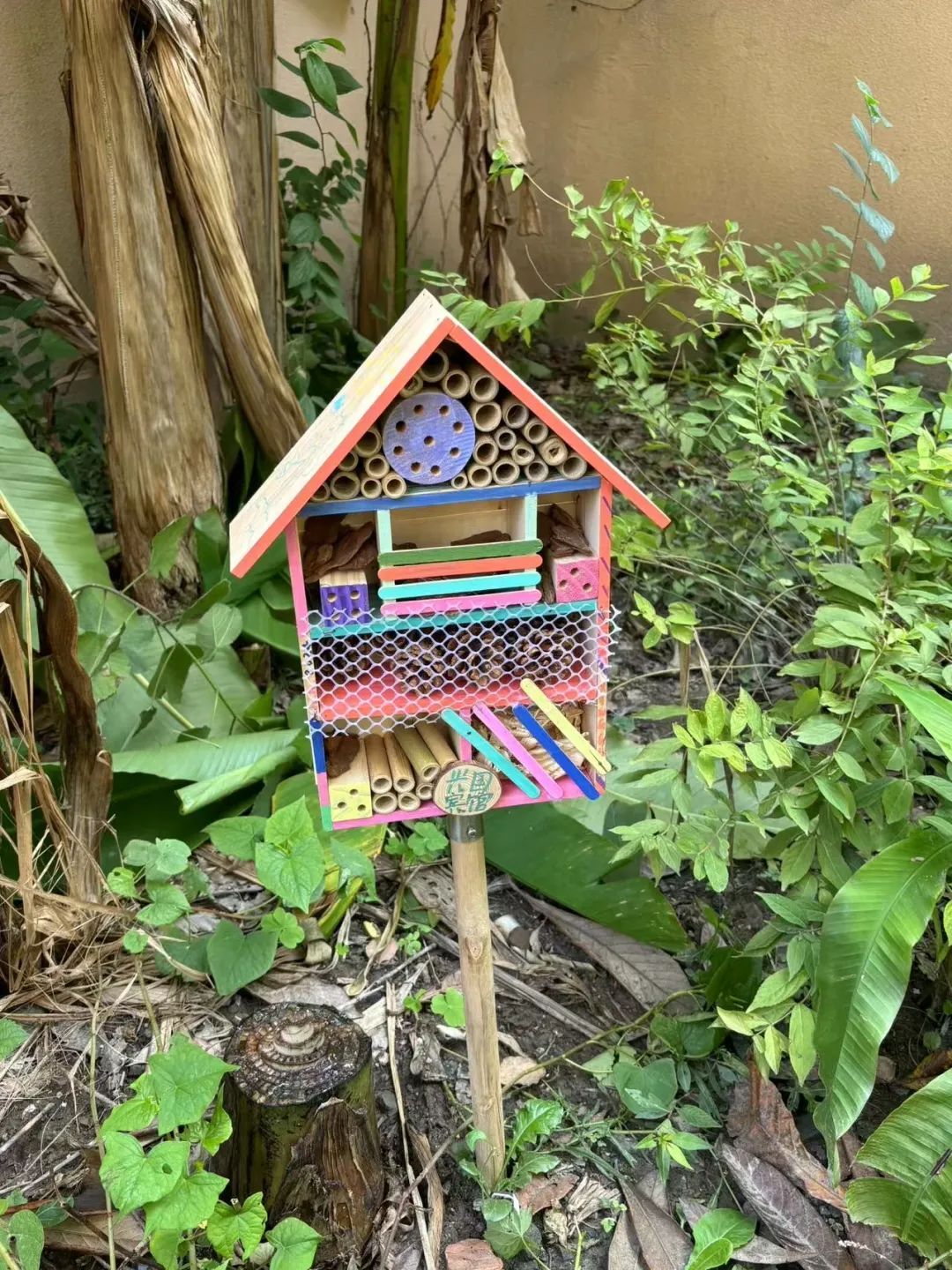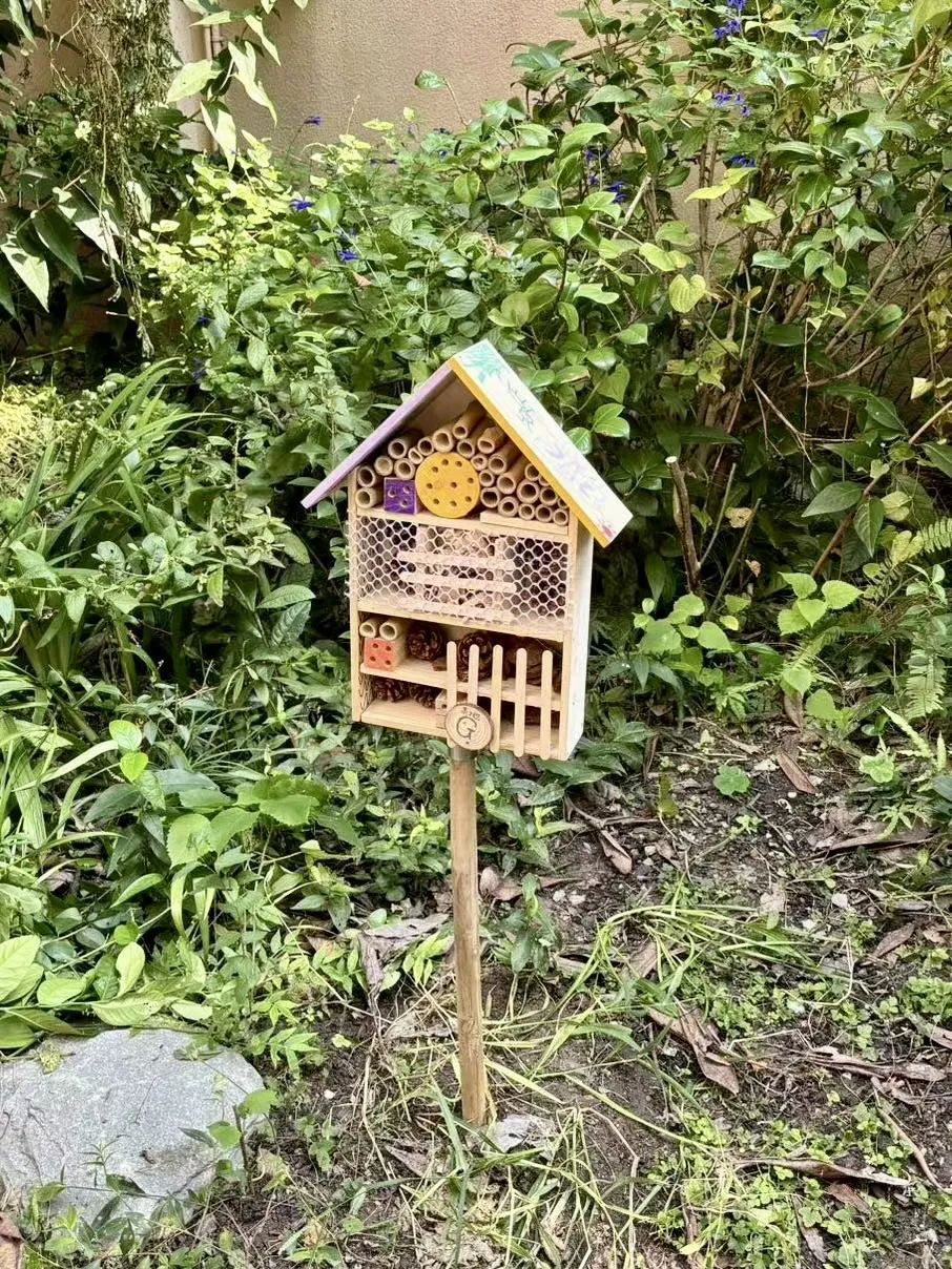 原来,昆虫旅馆又称昆虫屋或昆虫避难所,是利用循环可再利用的材料,比如木材、稻草、砖头、竹子、芦苇等,为各种昆虫提供不同类型的“房间”,供它们繁衍、栖息及越冬所用,以提高它们的存活概率。昆虫旅馆不仅为昆虫提供了栖息地,更是生境花园生态链中不可或缺的一环,对保护候鸟和昆虫具有重要的意义。