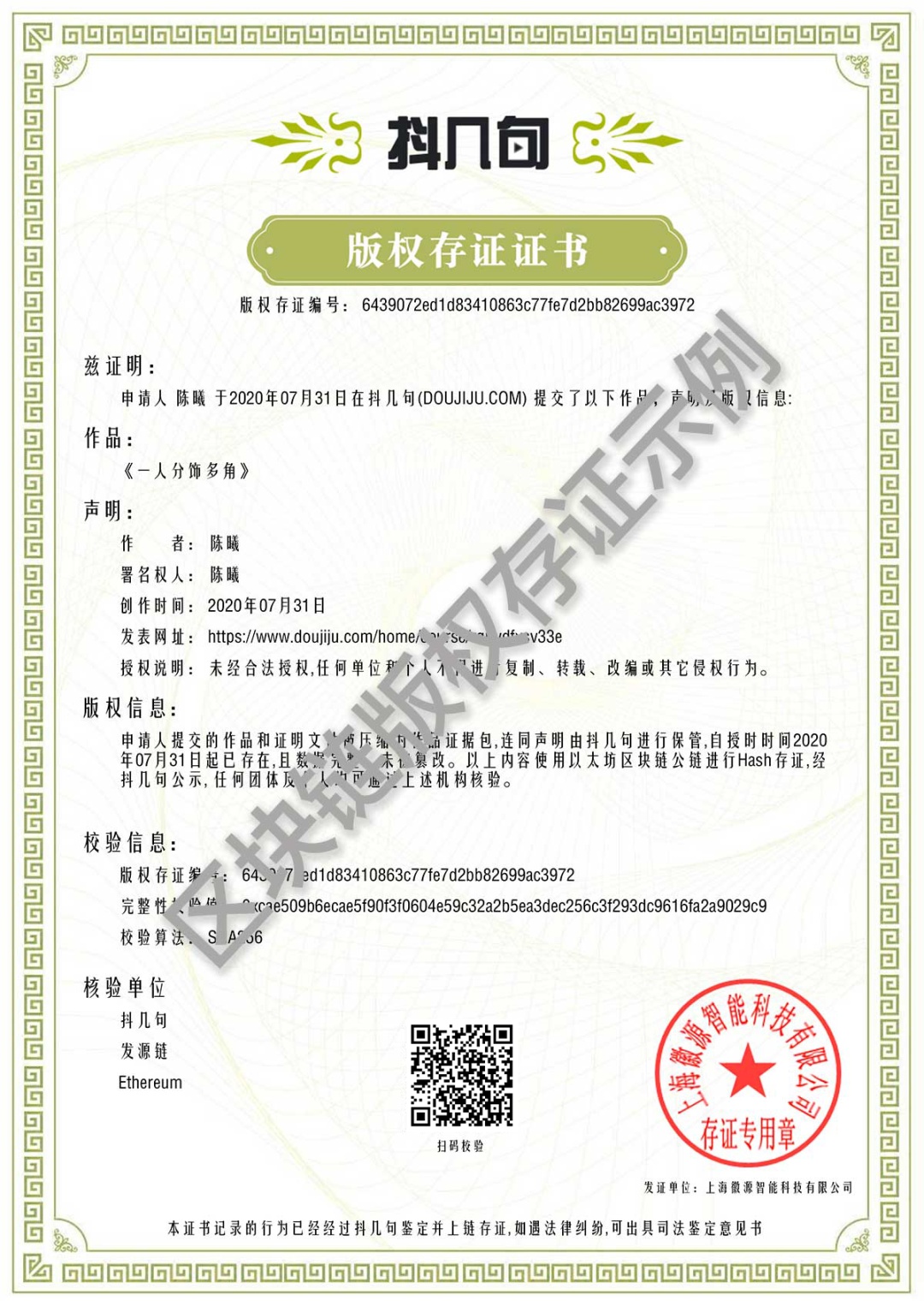抖几句版权存证证书样式