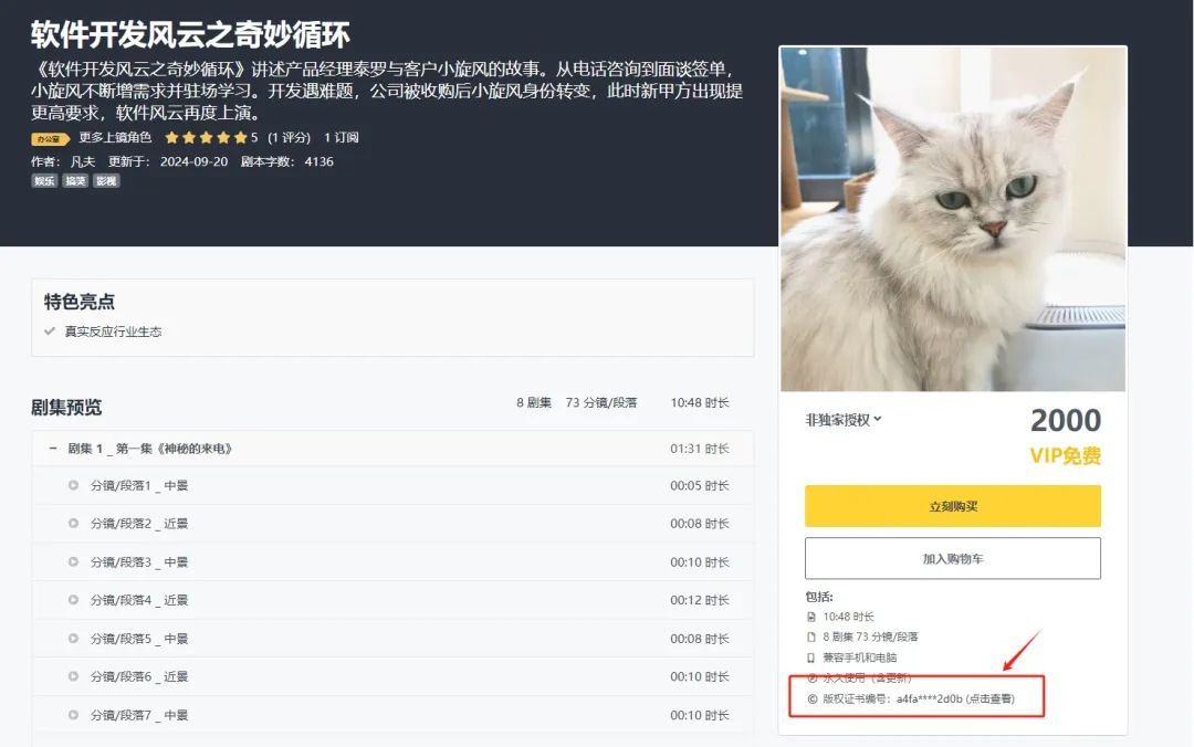 此外,抖几句的版权存证服务覆盖了平台上的所有原创内容。无论是一个幽默段子还是一部多达上百集的短剧剧本,都能得到全方位的版权保护。目前,抖几句版权存证已覆盖平台10000多位认证作者,39万部短视频及短剧剧本。每个剧本右侧订阅处均有版权存证编号,方便创作者随时查询。