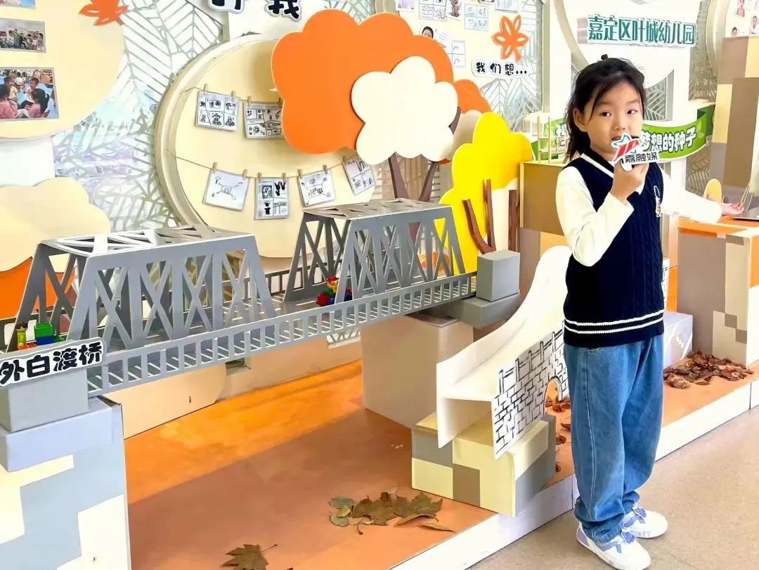 走进叶城幼儿园大厅,一座手工制作的外白渡桥伫立在此,细节刻画得栩栩如生。桥底下,孩子们还撒了片片落叶,一幅充满历史韵味的上海秋景图展现眼前。