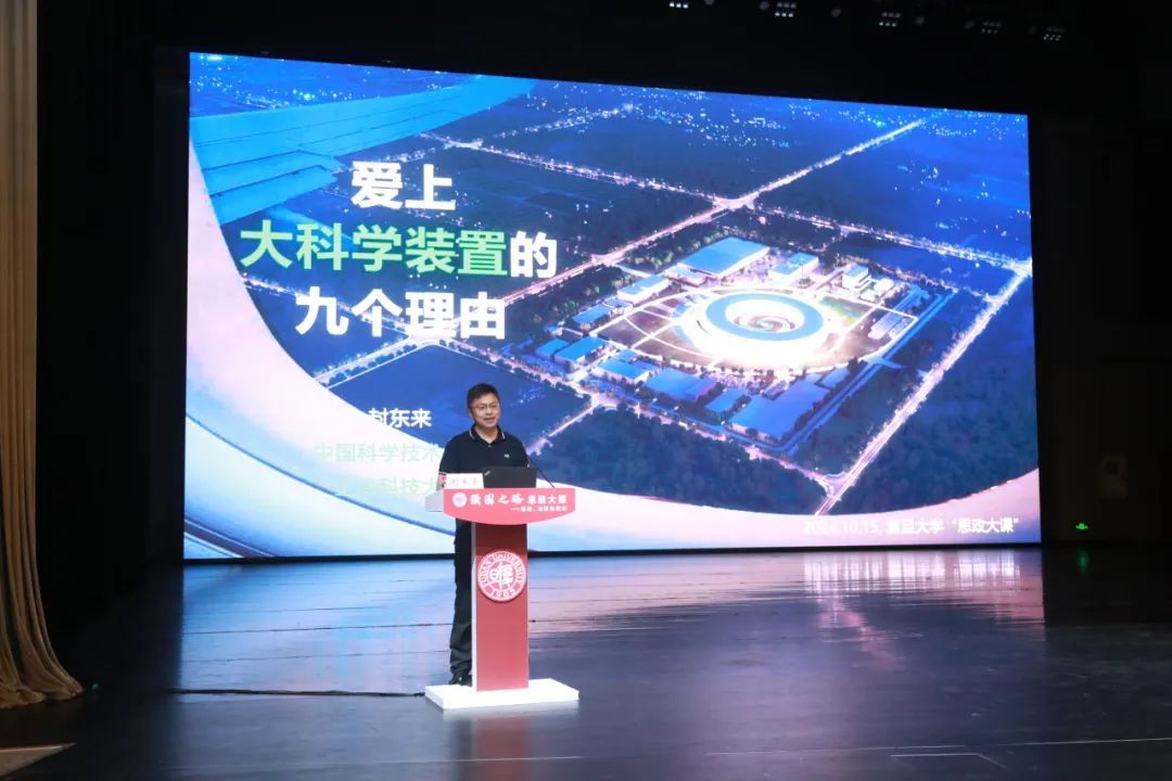 今天(10月15日)下午,伴随着大家热烈的掌声,原复旦大学物理系教授、中国科学技术大学教授、上海科技大学校长、中国科学院院士封东来走上相辉堂讲台,面向2024级、新生以《爱上大科学装置的九个理由》为题,开讲“强国之路”思政大课。