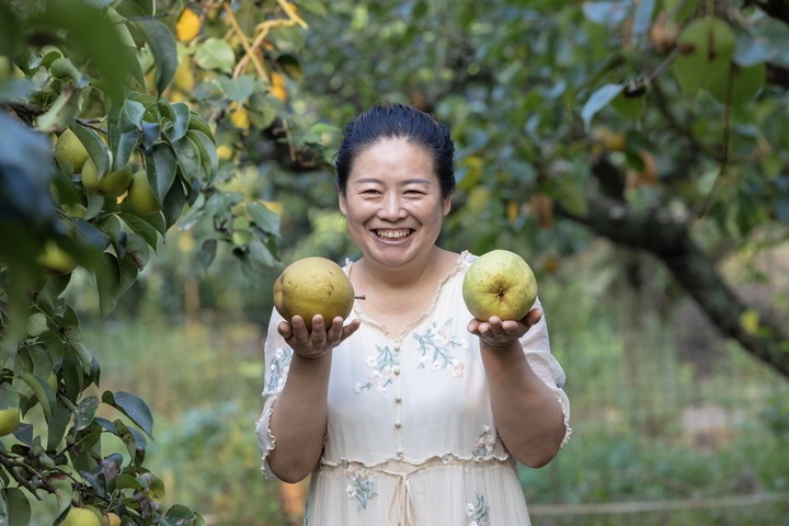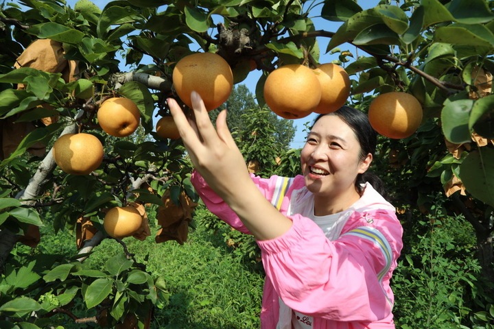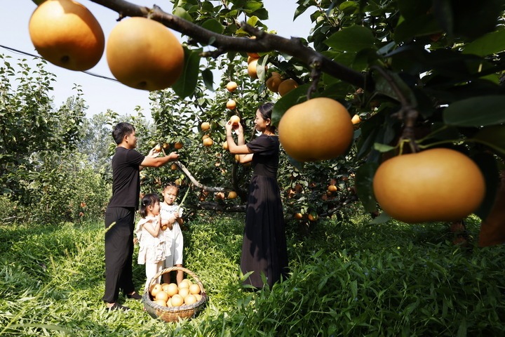 9月7日,连云港市东海县石梁河镇贾庄村晶丽黄梨合作社种植园内,游客正在采摘成熟的黄梨。李娇 摄