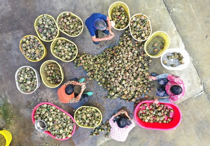 9月20日,淮安市洪泽区岔河镇江淮社区农民在采收、加工订单鸡头果。刘彬 摄