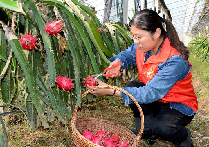 10月11日,睢宁县梁集镇现代农业科技示范基地火龙果采摘园内,该镇农业公司的员工们正在帮助果农采摘秋季火龙果。张格波 摄