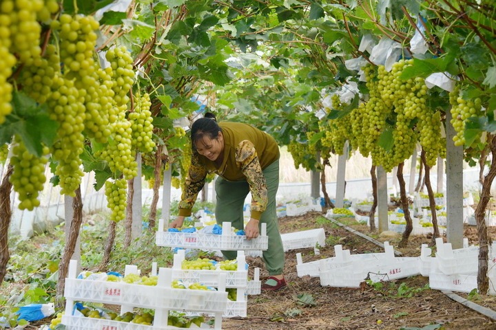 10月16日,淮安市洪泽区高良涧街道洪泽园三村社区,一家葡萄园种植基地,工人们正在采摘阳光玫瑰葡萄准备直供北京市场。崔德圣 摄