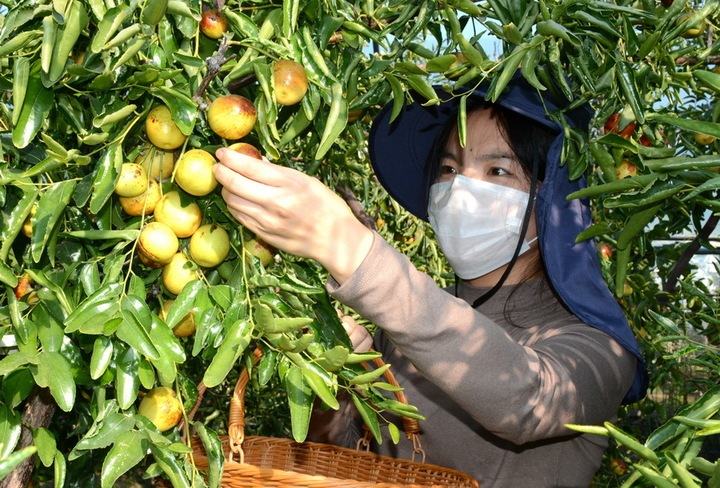 10月4日,睢宁县梁集镇高楼村冬枣园,乡村游客正在采摘冬枣。张格波 摄