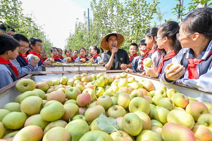 9月25日,宿迁市洋河新区郑楼实验学校学生走进万亩苹果园,听农技人员讲解苹果种植知识,感受丰收的喜悦。陈少帅摄