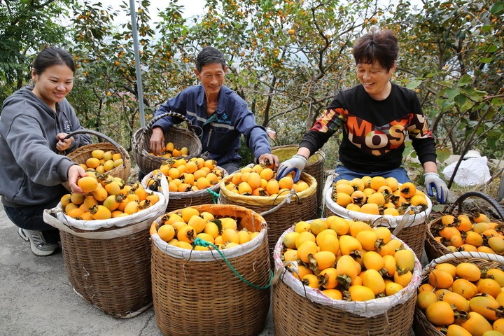 10月16日,连云港市连云区云山街道1500亩无公害牛心柿进入成熟采摘期,黄澄澄的果实挂满枝头,映衬出山村特有的秋韵,果农忙着采摘、分拣、销售。朱华南 张祎婕 摄