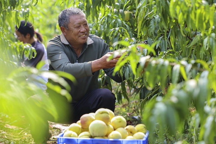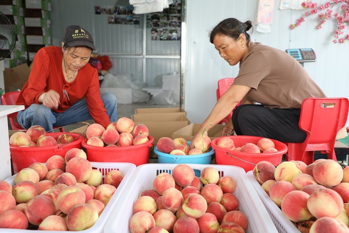9月2日,阜宁县三灶镇七灶村金秋桃园家庭农场的果农正在分装桃子,准备供应市场。顾建 张恒飞 摄