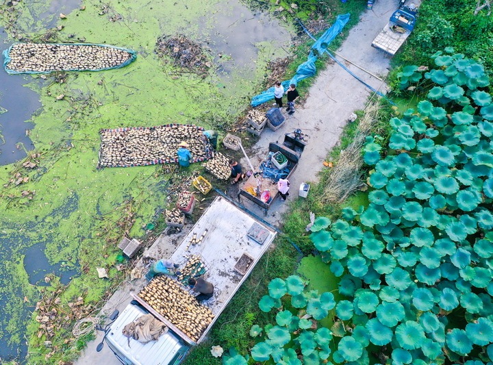 9月7日,如皋市如城街道新民社区千亩荷塘,藕农采挖莲藕,准备供应市场。徐慧 摄
