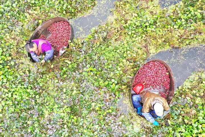 10月12日,淮安市洪泽区东双沟镇滨湖社区红菱种植基地,种植户采摘生态红菱增收。刘彬 摄