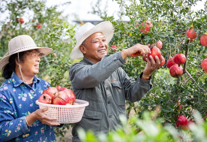 10月12日,海安市大公镇仲洋村农民在采摘石榴。当地大力发展特色农业,同时积极探索农文旅融合的新路子,助推乡村振兴。翟慧勇摄