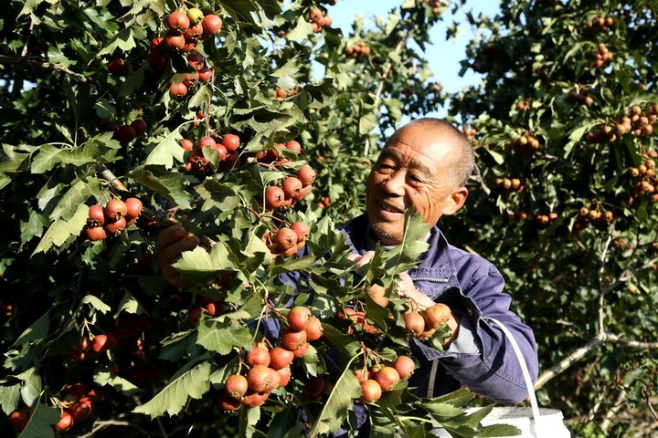 10月8日,连云港市连云区云山街道李庄村的果农正在采摘山楂。王春 摄