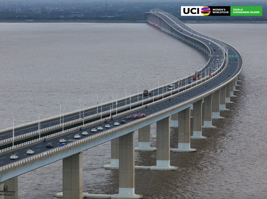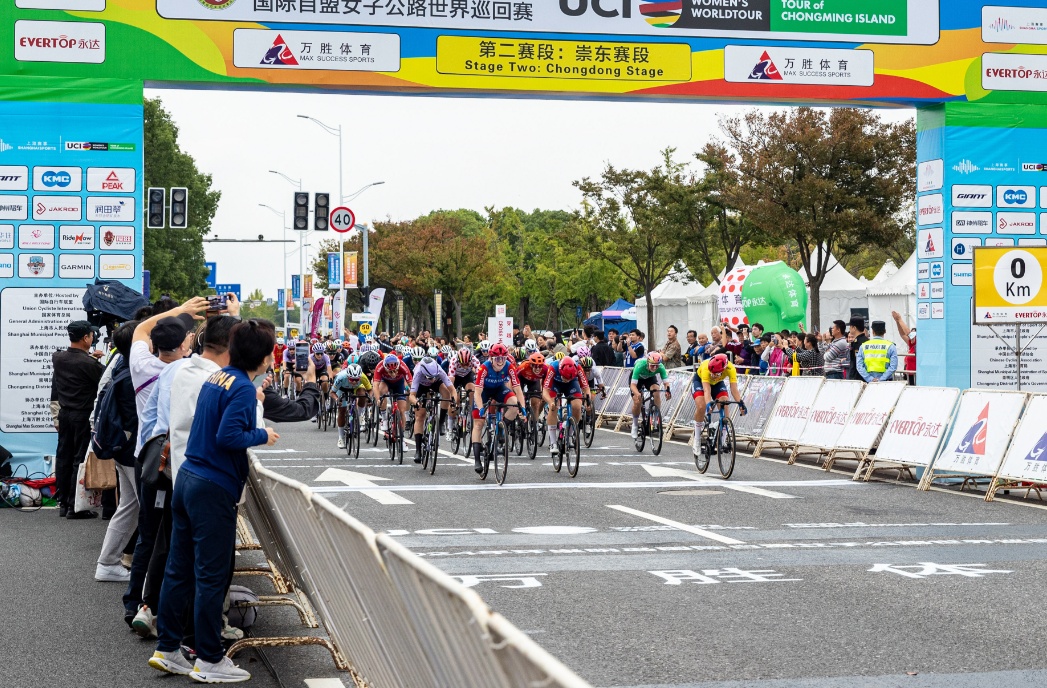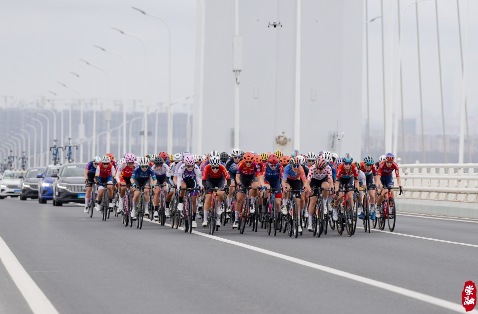 上午11点10分,随着发令枪响,在身着各色领骑衫选手的带领下,参赛选手们奋力向前骑行。沿着秋柑路平稳骑行后,车队很快骑至雄伟壮丽的上海长江大桥。骑至桥面时,横风给选手骑行带来了更多挑战,不过集团中后方有部分选手利用横风向前突围,致使集团形态发生了一些变化。