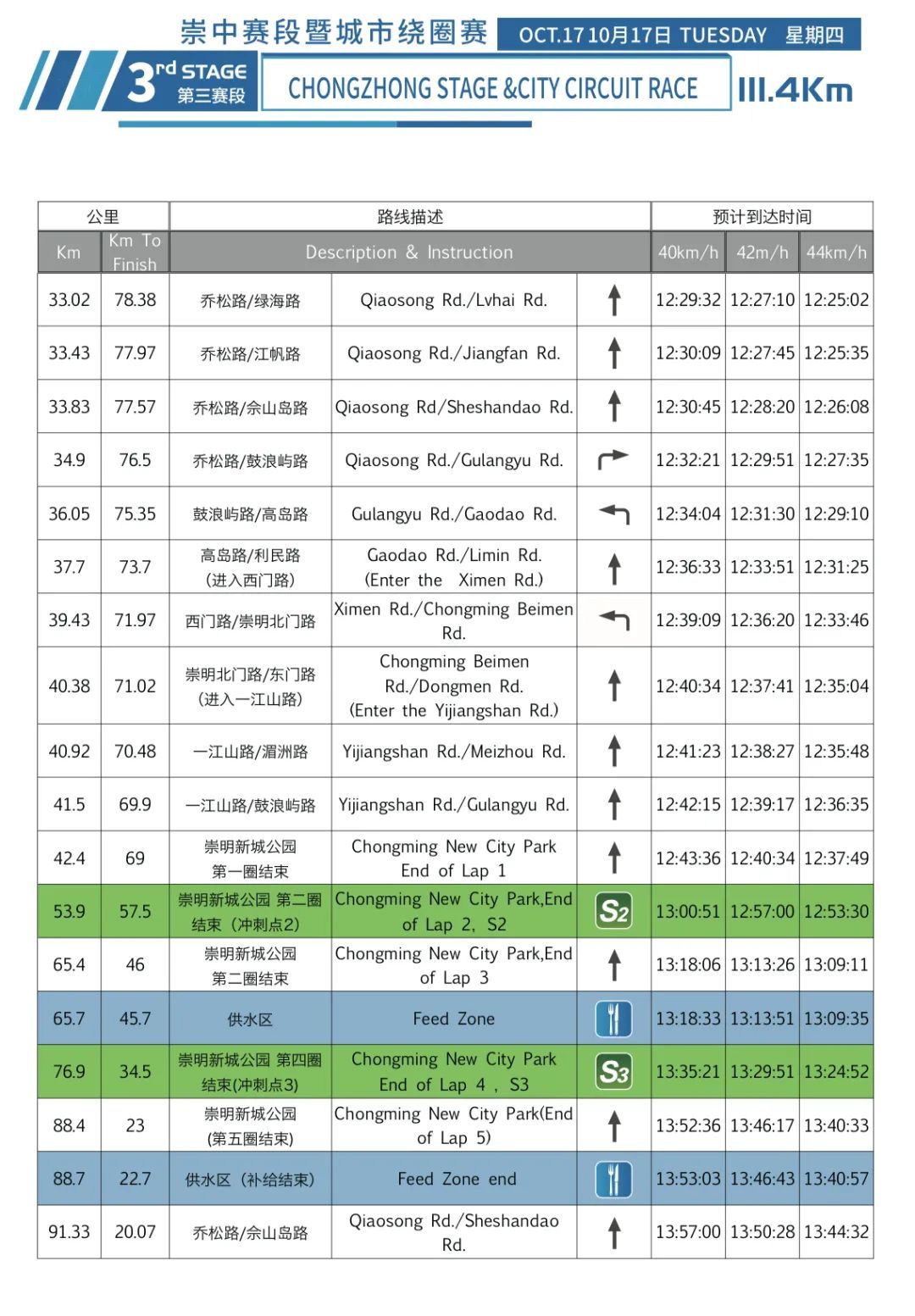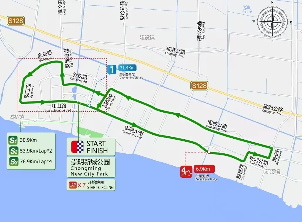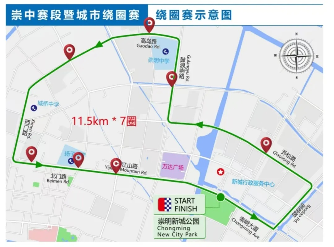 崇明大道新城公园(起点)→崇明大道→新梅路→新河公路(经新河镇镇区)→新中路→团城公路→宝岛路(逆向车道)→乔松路→鼓浪屿路→高岛路→崇明西门路→崇明北门路→一江山路→崇明大道(开始绕圈*7圈)→乔松路→鼓浪屿路→高岛路→西门路→北门路→一江山路→崇明大道(新城公园)终点(画线部分为城市绕圈赛)