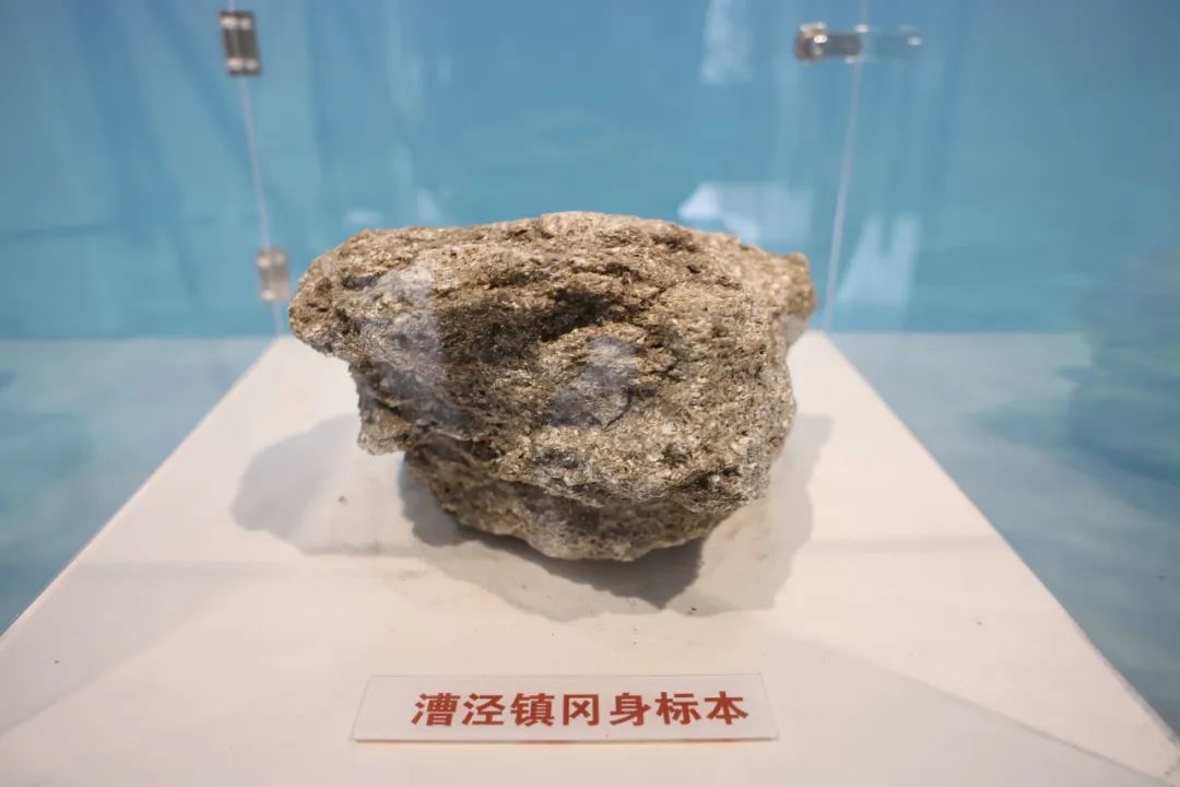 序厅C位展示的是一块漕泾镇冈身标本,仔细看能在标本上找到远古贝类生物的壳体。余思彦介绍,标本采集于漕泾镇沙积村,仔细看,岩石中夹杂镶嵌着相当多的已经钙化的贝壳类踪迹,“冈身里除了淤泥和砂石外,还藏着很多贝类生物的遗骸。冈身中的贝壳属种有兰蛤、毛蛤、蛏、近江牡蛎、织纹螺等近二十种,其中以兰蛤最占优势,个体数量一般占比超过50%。”