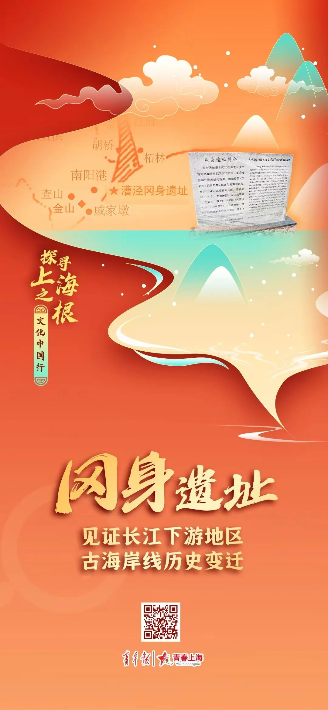 这是金山区人民政府于2005年10月26日公布的金山区古文化遗址保护地点。石碑上还贴有一个二维码,扫一扫能跳转至金山博物馆的科普页面,页面罗列了冈身遗址所属街镇、地址和简介。