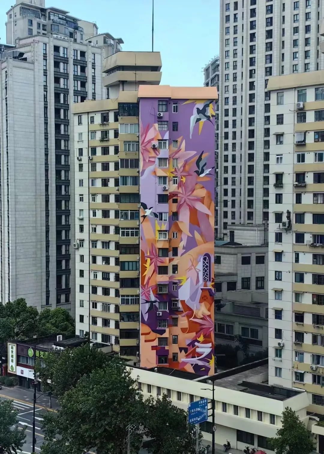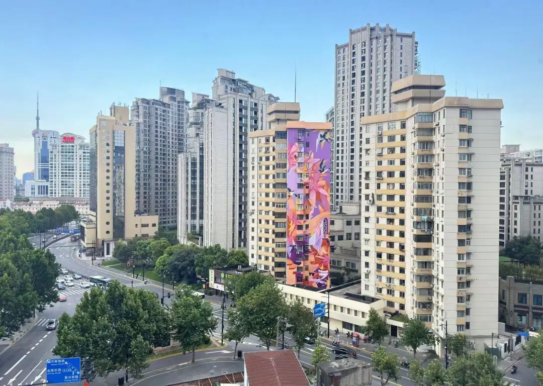 人民路,上海的“C”位之路,一头连着老城厢,一头望向陆家嘴,上海人亲切地称它为“穿越之门”。位于人民路上的人民大楼因为一幅高达55米的巨型艺术墙绘而成为了这里的新地标。这幅名为“露香春景”的作品,覆盖了整栋楼17层的外墙,画面中,“细巧巢篱萦乳燕,家园如画满春山”的温馨意境徐徐铺展,让原本有些陈旧的人民大楼一下子迎来了“诗意新生”。