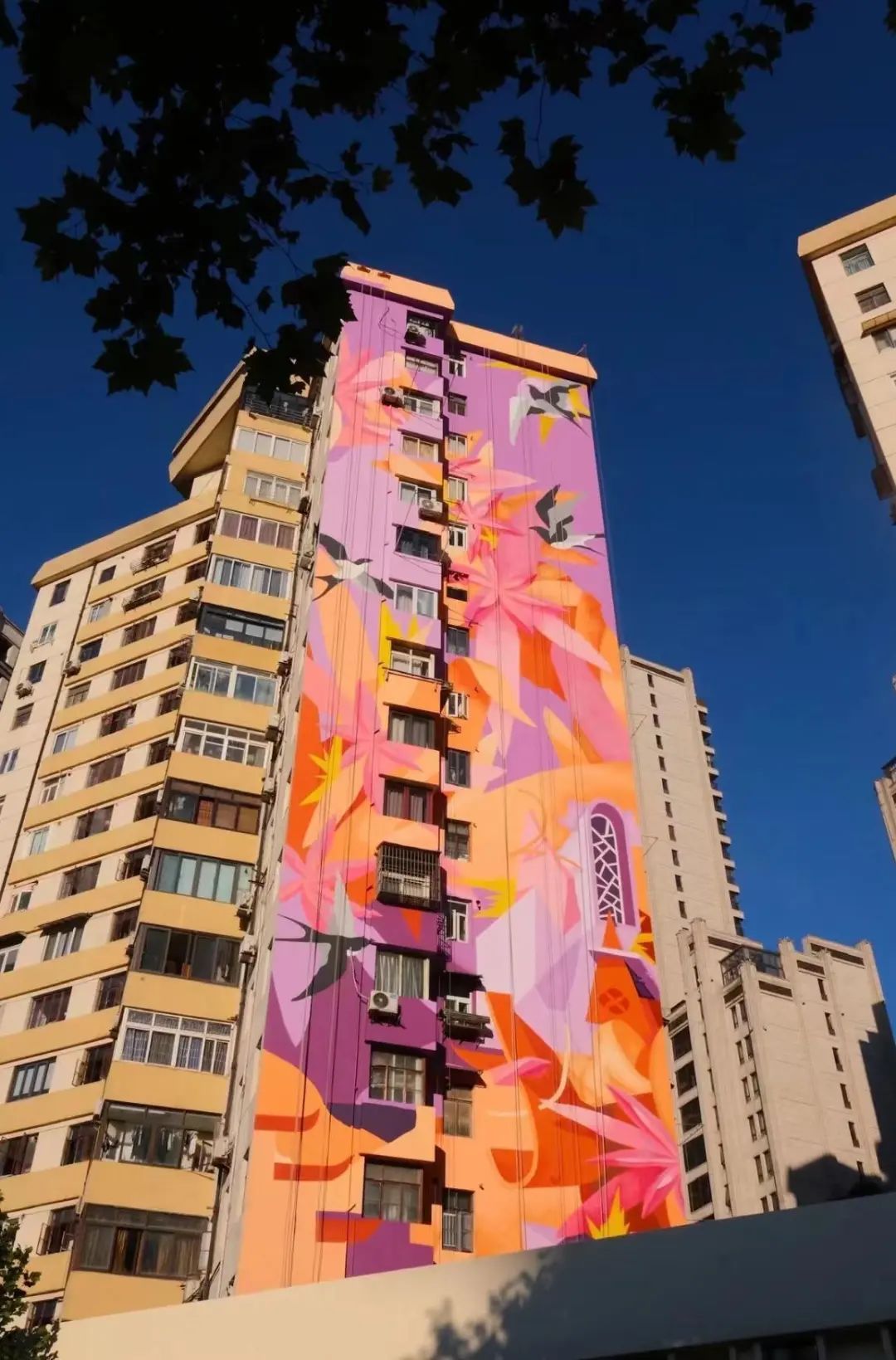 “筑巢成家忙碌间,燕子婆娑舞飞翻。”高55米,覆盖17层楼的巨幅“露香春景”涂鸦艺术作品坐落于人民大楼小区西墙的狭长墙面上,由新锐涂鸦艺术家、哈佛大学建筑学博士陈拾叁绘制而成,其设计灵感来源于古代中国画中的长卷,以露香园“桃树”和“燕子”为主要元素,生动地展现了春日燕子衔泥筑巢、引凤来仪的美好景象。