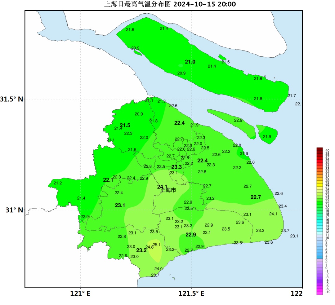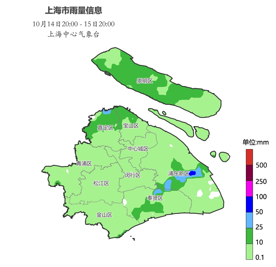 昨天上海是阴到多云有时有阵雨或雷雨的天气。14日20时至15日20时的雨量统计显示,全市普降小雨,北部地区达到中雨,浦东个别站点出现大雨。徐家汇站全天气温在20.7~23.3℃之间。