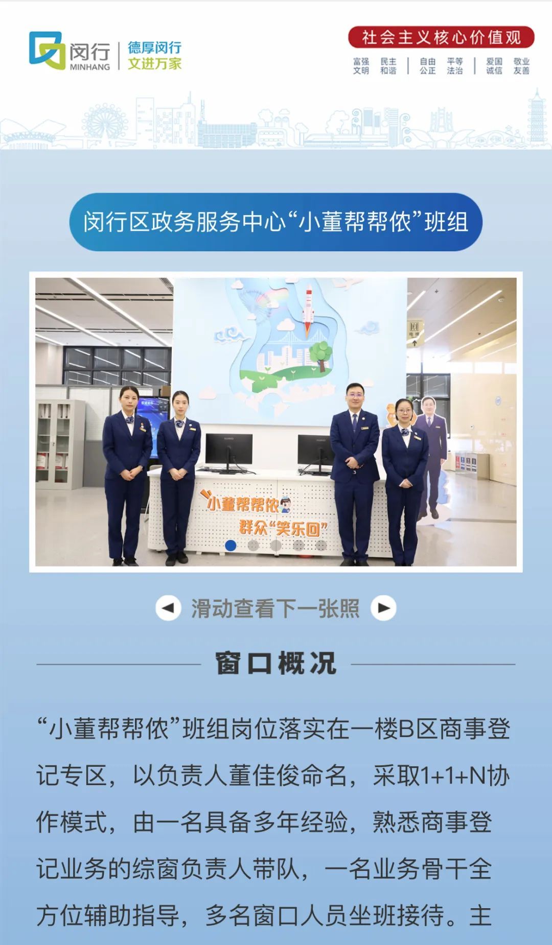闵行区行政服务中心的江小帮——“倪”帮侬服务站、“文津暖心”班组及“小董帮帮侬”班组,以贴心细致的服务赢得了群众的信赖与好评;