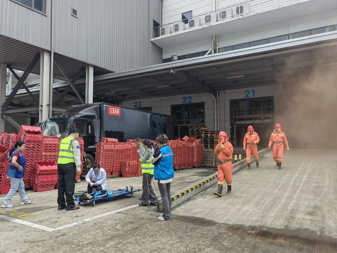 下午2点,随着急促的消防警报声响起,园区员工迅速从各个疏散通道有序撤离。各楼层的专职人员同步检查所在楼层区域,确保没有遗留人员,并救出一名预设的“受伤人员”。几分钟后,员工按照规定路线成功集合至预先设定的安全地点。