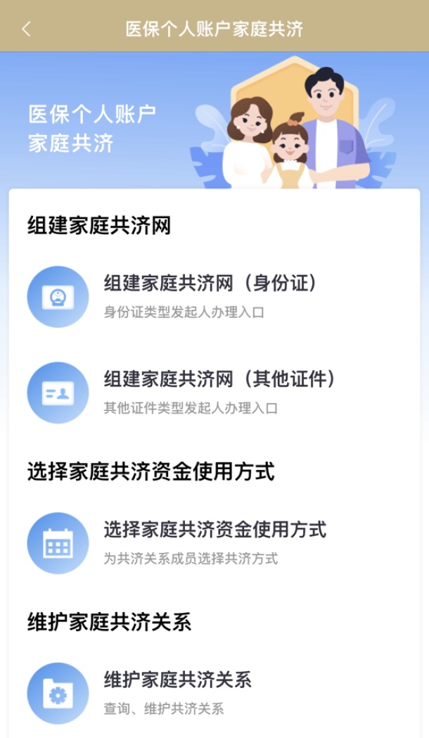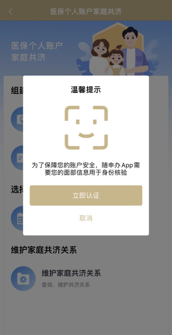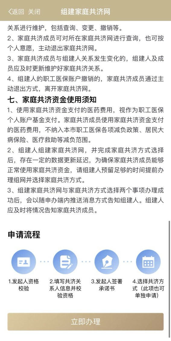 选择“组建家庭共济网(身份证)”/“组建家庭共济网(其他证件)”,进入后需进行人脸识别,阅读相关服务指南,选择“立即办理”,等待系统校验符合家庭共济网组建人资格后方可进入服务。
