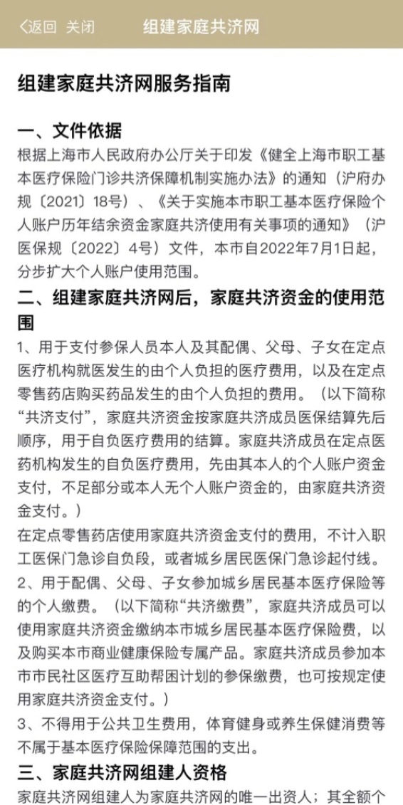 上海市职工基本医疗保险参保人与配偶、父母或子女组建家庭共济关系网,为家庭共济成员选择的共济方式包含“共济缴费”的,可使用其个人账户历年结余资金为家庭成员缴纳城乡居民基本医疗保险费。在确定家庭共济成员有意愿参加居民医保后,医保部门按规定自动从组建人历年账户结余资金中划扣年度参保费,无需组建人主动发起缴费动作。