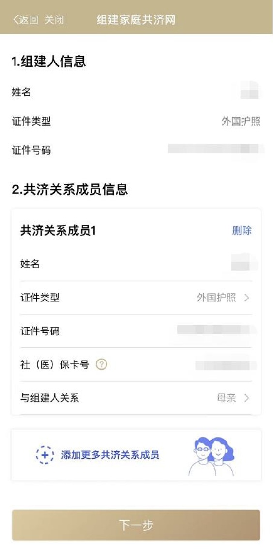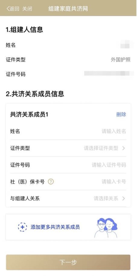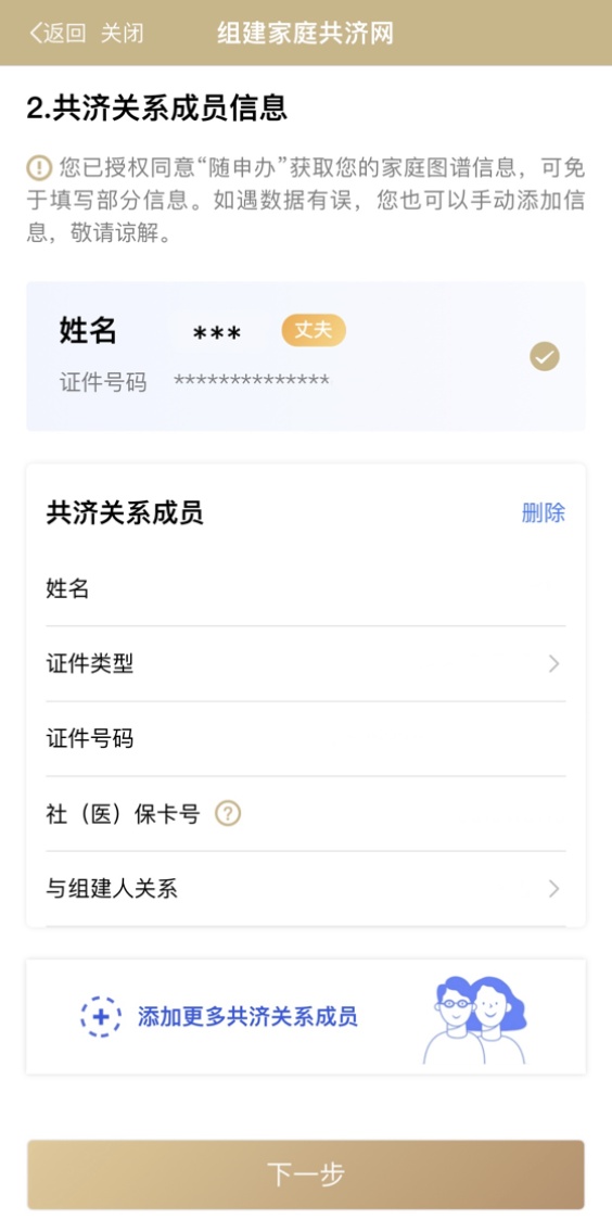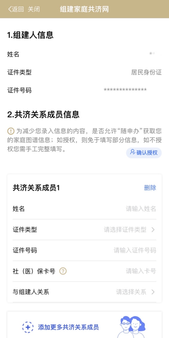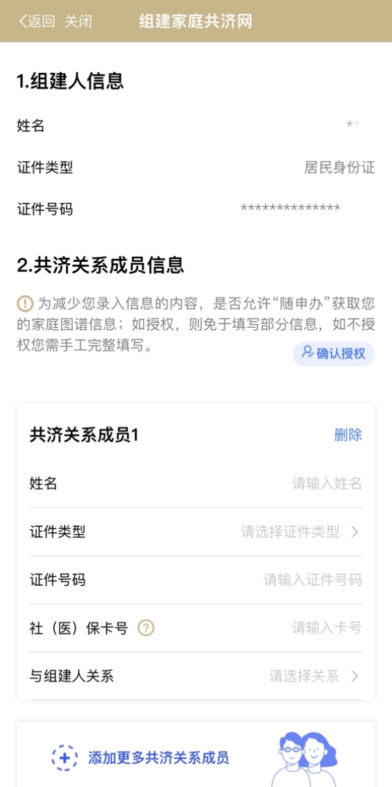 身份证用户可授权“随申办”获取家庭图谱信息,家庭图谱内的成员信息可免于填写,直接勾选;不在家庭图谱内的成员信息需手动填写完整。使用其他证件的组建人需手工填写完整的共济成员信息。共济成员的证件类型也同时支持身份证或其他证件类型。