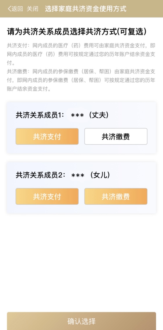 家庭共济网组建完成后,直接跳转进入“选择家庭共济资金使用方式”页面,也可退出后从主页进入该项服务。可为每一位共济成员选择家庭共济资金使用方式。两种共济方式可单选或复选。选择“共济缴费”后,点击底部“确认选择”即可。