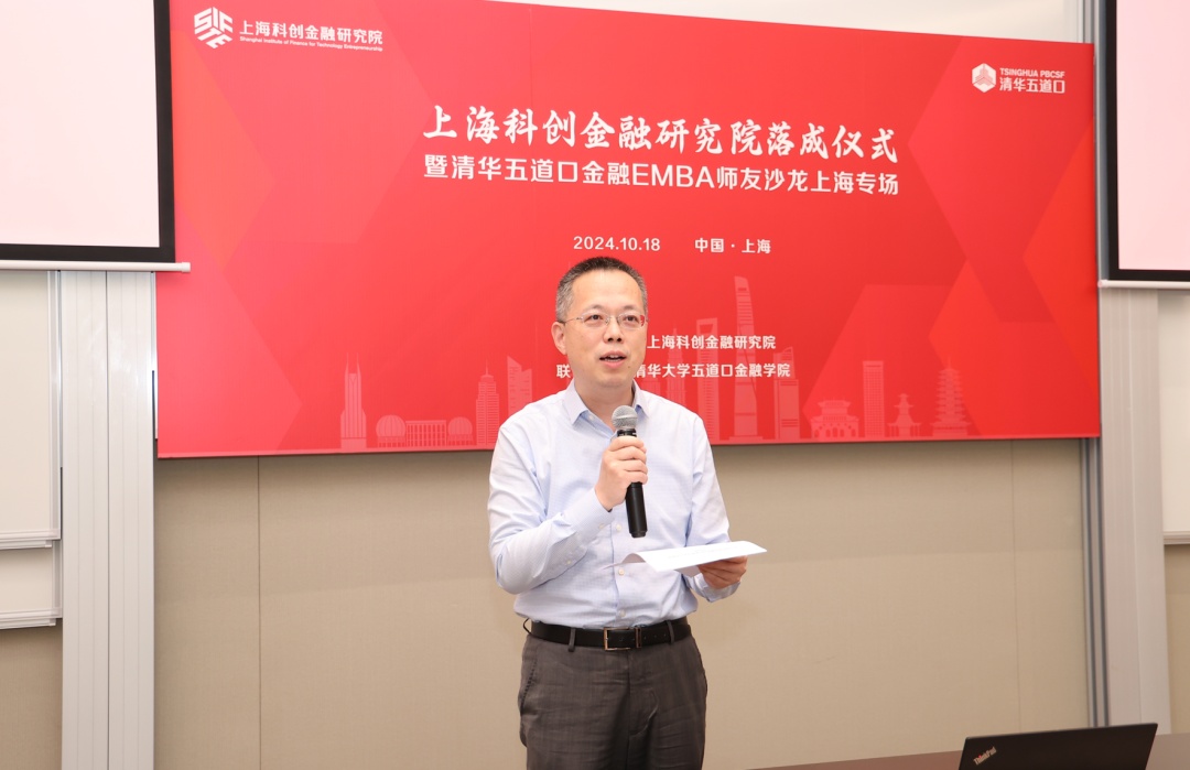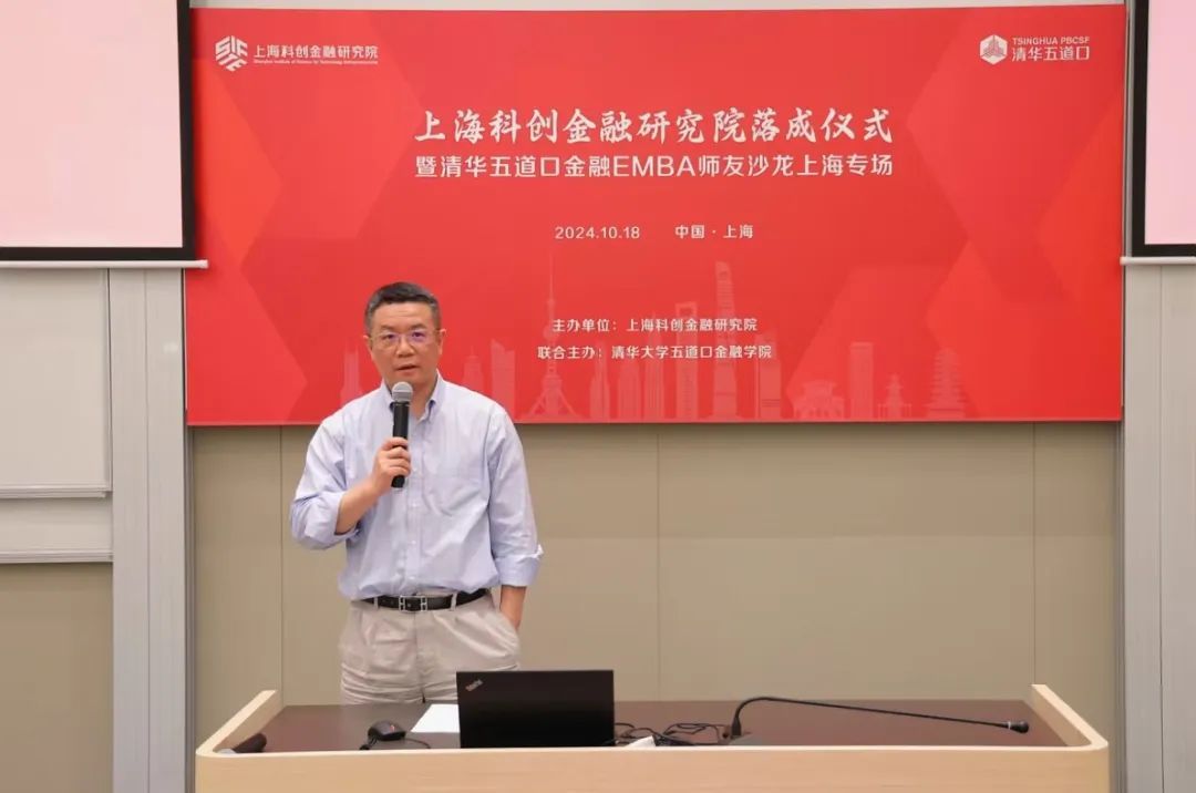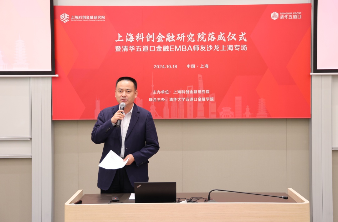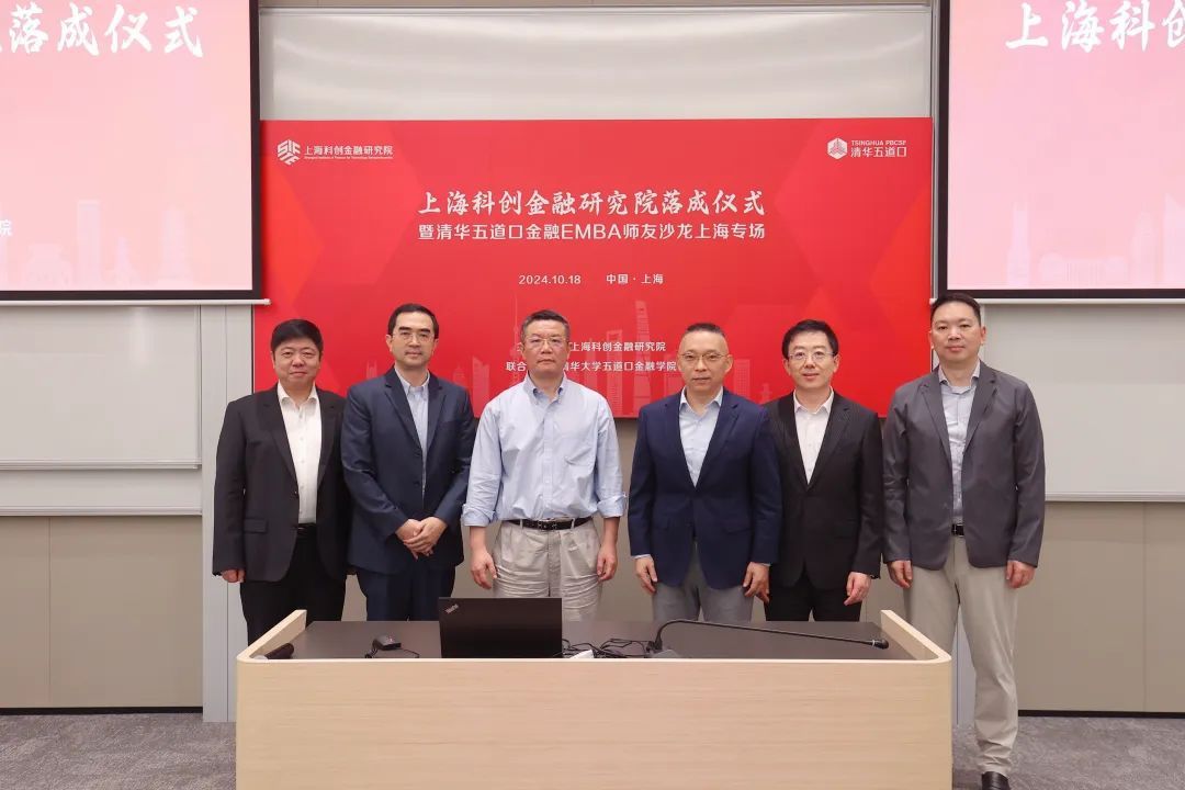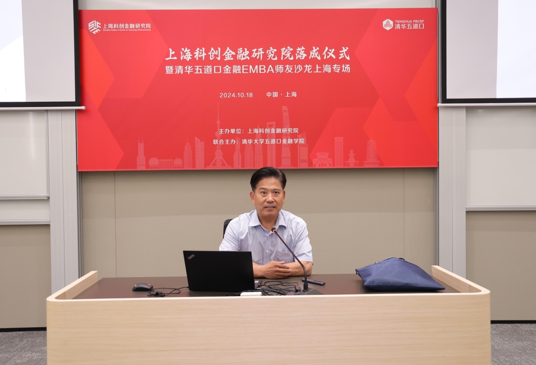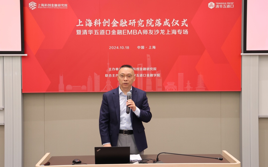 落成仪式后,上海科创金融研究院联合清华大学五道口金融学院举办“清华五道口金融EMBA师友沙龙上海专场”活动,共同探索科创与金融融合发展的合作模式。原中国证监会主席助理、党委委员,中国贸促会副会长、党组成员张慎峰以“金融强国与资本市场建设”为主题进行了闭门讲座。
