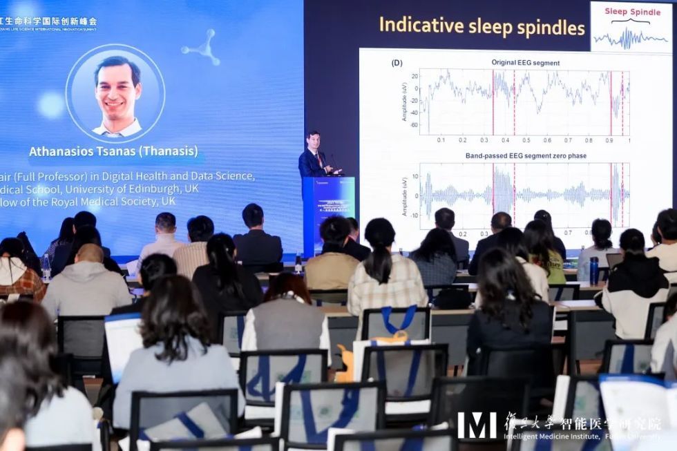 欧洲分子生物学实验室德国海德堡总部主任Peer Bork以《Gut microbiome analysis for human health and wellbeing》为题进行了精彩的开场学术报告。他重点阐述了肠道微生物组在诊断和治疗中的潜力。德国科学院院士Roland Eils带来了《AI in health: opportunities for disease prevention and therapy》报告。他重点阐述了深度学习技术在处理和分析健康数据中的潜力,特别强调了大型语言模型在真实患者数据中的应用。英国爱丁堡大学医学院数字健康与数据科学系主任、英国皇家医学会会士Athanasios Tsanas以《Hypnogram-free, single lead automated EEG analysis for accurate》为题从数字健康和数据科学的角度,探讨了睡眠纺锤波与睡眠质量的关系等等。